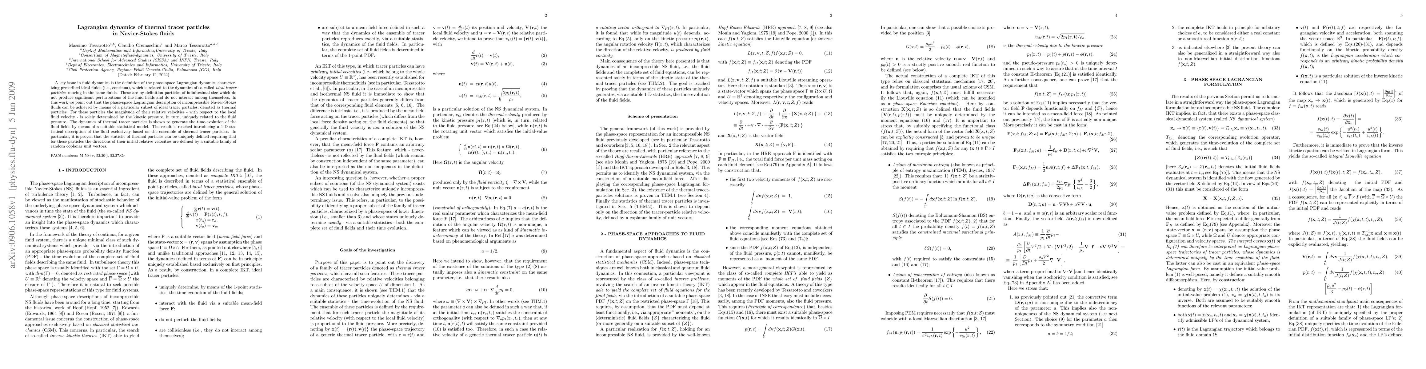 A key issue in fluid dynamics is the definition of the phase-space Lagrangian dynamics characterizing prescribed ideal fluids (i.e., continua), which is related to the dynamics of so-called \textit{ideal tracer particles} moving in the same fluids. These are by definition particles of infinitesimal size which do not produce significant perturbations of the fluid fields and do not interact among themselves. In this work we point out that the phase-space Lagrangian description of incompressible Navier-Stokes fluids can be achieved by means of a particular subset of ideal tracer particles, denoted as thermal particles. For these particles the magnitude of their relative velocities - with respect to the local fluid velocity - is solely determined by the kinetic pressure, in turn, uniquely related to the fluid pressure. The dynamics of thermal tracer particles is shown to generate the time-evolution of the fluid fields by means of a suitable statistical model. The result is reached introducing a 1-D statistical description of the fluid exclusively based on the ensemble of thermal tracer particles. In particular, it is proven that the statistic of thermal particles can be uniquely defined requiring that for these particles the directions of their initial relative velocities are defined by a suitable family of random coplanar unit vectors.