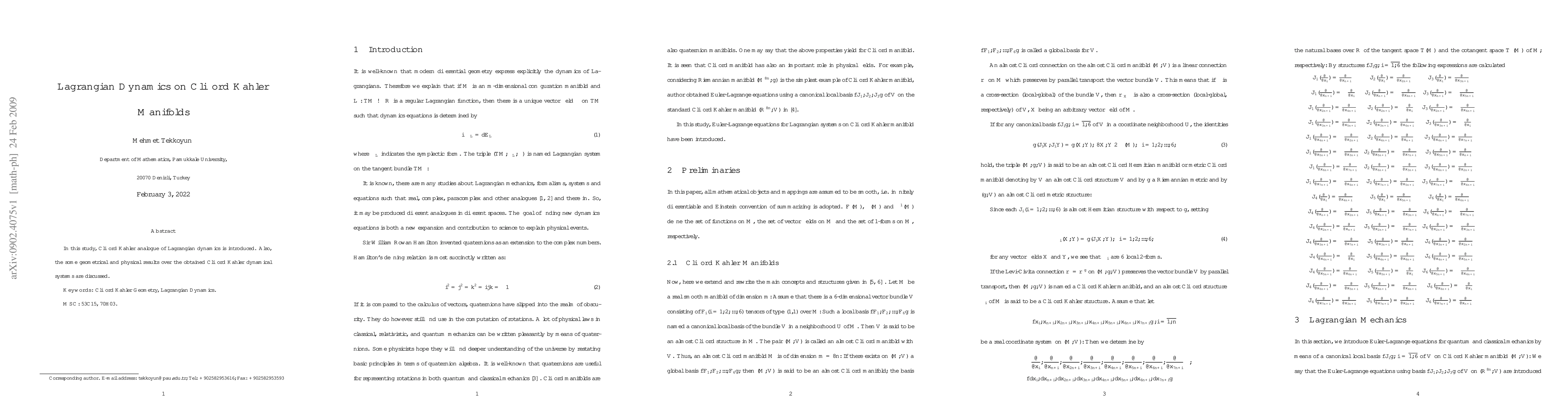 This paper introduces the Lagrangian dynamics on Clifford Kaehler manifolds, presenting a Clifford Kaehler analogue of traditional Lagrangian dynamics and discussing associated geometrical and physical implications.