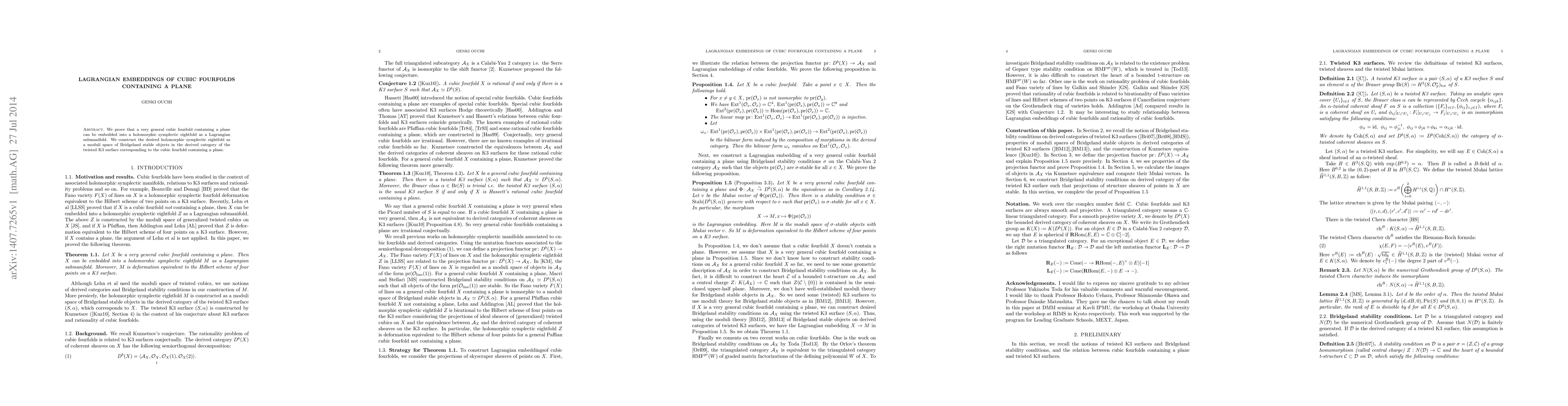 This research proves that a general cubic fourfold with a plane can be embedded as a Lagrangian submanifold in a holomorphic symplectic eightfold, constructed as a moduli space of Bridgeland stable objects in the derived category of the twisted K3 surface associated with the fourfold.