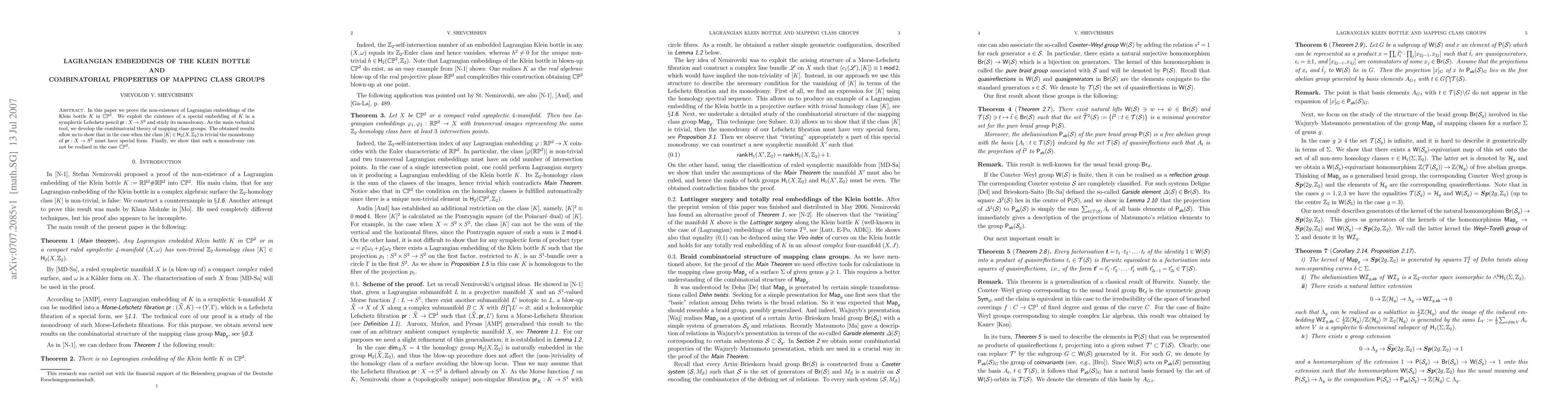 Summary: The paper proves the non-existence of Lagrangian embeddings of the Klein bottle in \CP^2 and develops the theory of mapping class groups as quotients of special Artin braid groups to study their combinatorial properties.