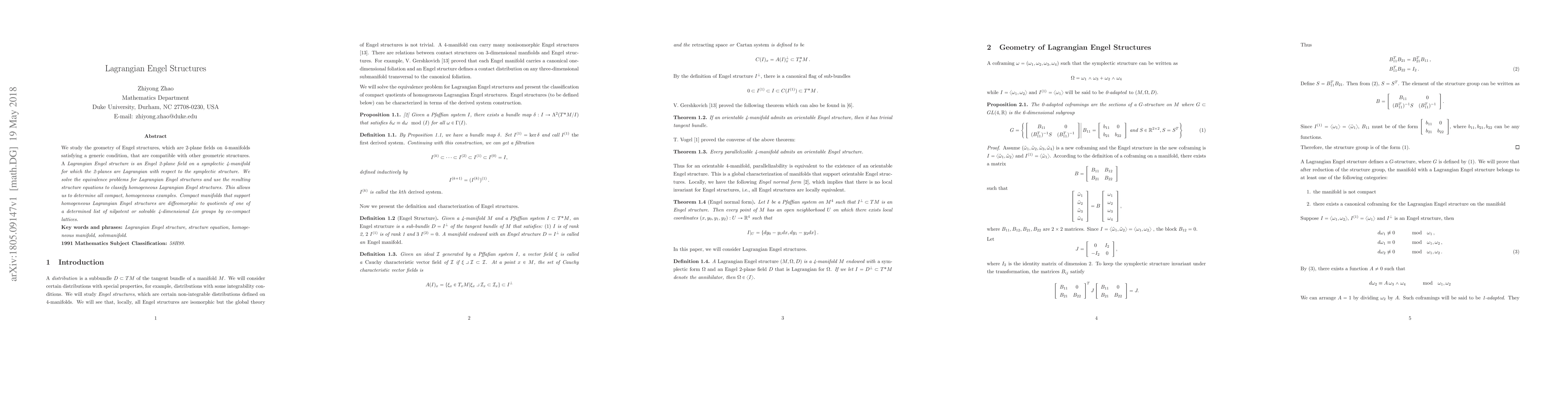 This paper investigates the geometry of Lagrangian Engel structures, which are specific 2-plane fields on 4-manifolds that are both symplectic and Lagrangian. The authors solve equivalence problems and classify homogeneous Lagrangian Engel structures, determining that compact manifolds supporting such structures are diffeomorphic to quotients of certain nilpotent or solvable Lie groups.