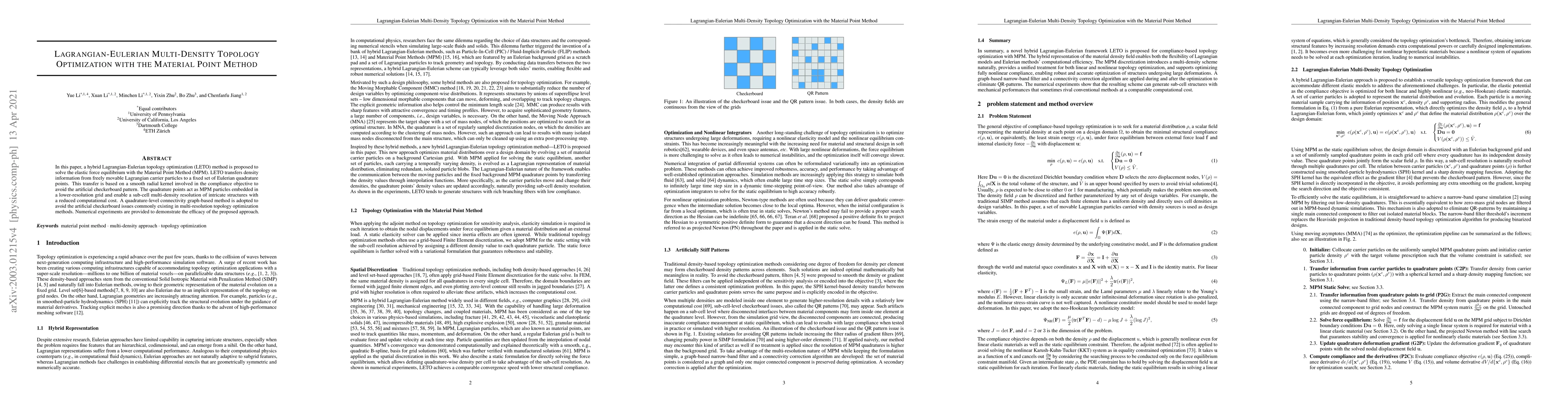 This paper proposes a hybrid Lagrangian-Eulerian topology optimization method using the Material Point Method to solve elastic force equilibrium, transferring density information from Lagrangian particles to Eulerian points to avoid checkerboard patterns and reduce computational cost. Numerical experiments validate the effectiveness of the approach.