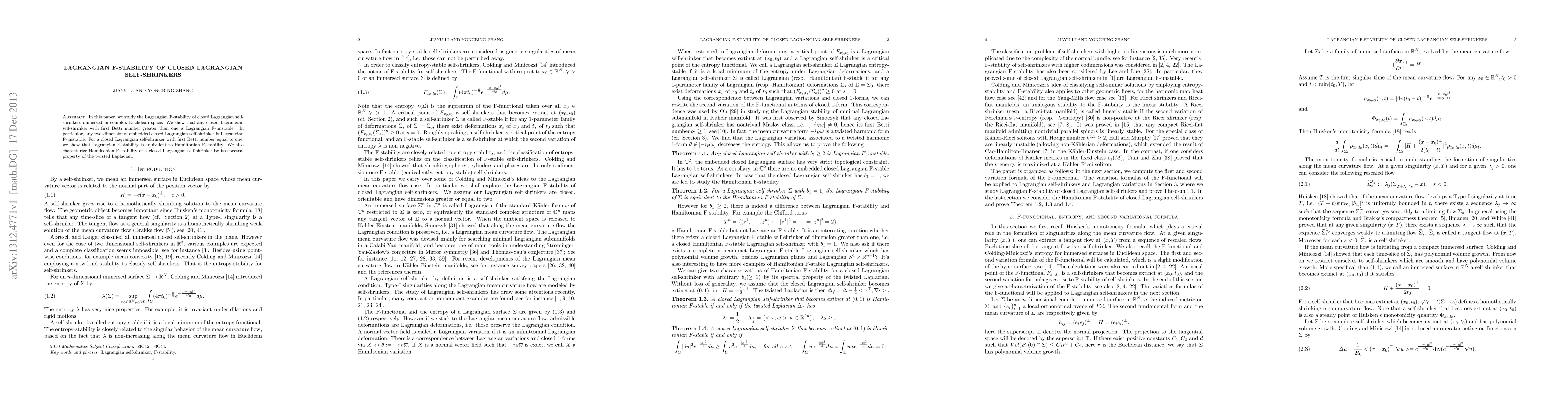 This paper investigates the Lagrangian F-stability of closed Lagrangian self-shrinkers in complex Euclidean space, demonstrating that those with a first Betti number greater than one are Lagrangian F-unstable. It also establishes the equivalence of Lagrangian and Hamiltonian F-stability for self-shrinkers with a first Betti number of one, linking this stability to the spectral properties of the twisted Laplacian.