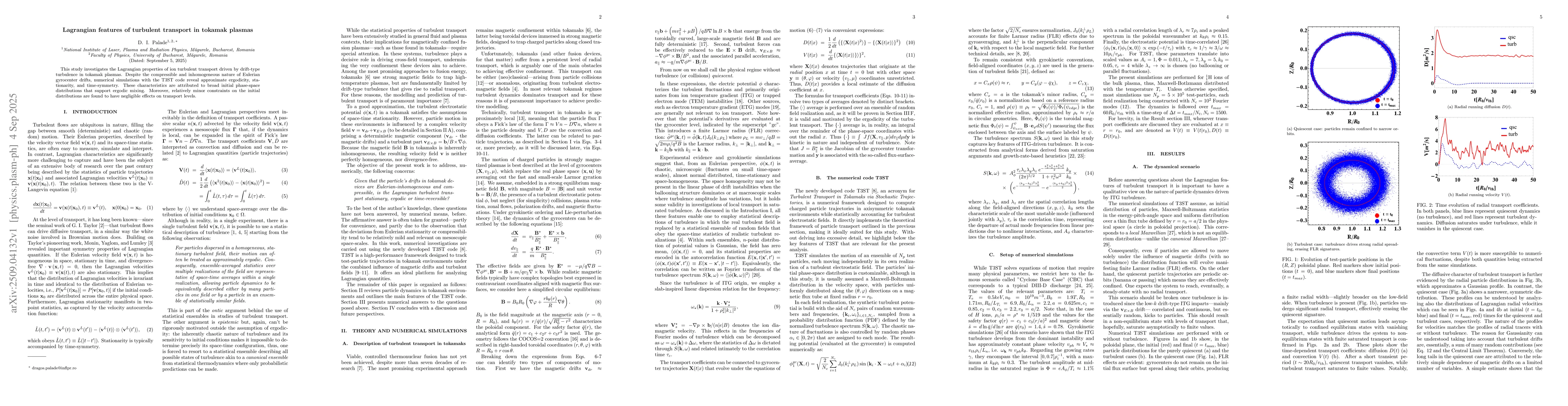 This study investigates the Lagrangian properties of ion turbulent transport driven by drift-type turbulence in tokamak plasmas. Despite the compressible and inhomogeneous nature of Eulerian gyrocenter drifts, numerical simulations with the T3ST code reveal approximate ergodicity, stationarity, and time-symmetry. These characteristics are attributed to broad initial phase-space distributions that support ergodic mixing. Moreover, relatively minor constraints on the initial distributions are found to have negligible effects on transport levels.