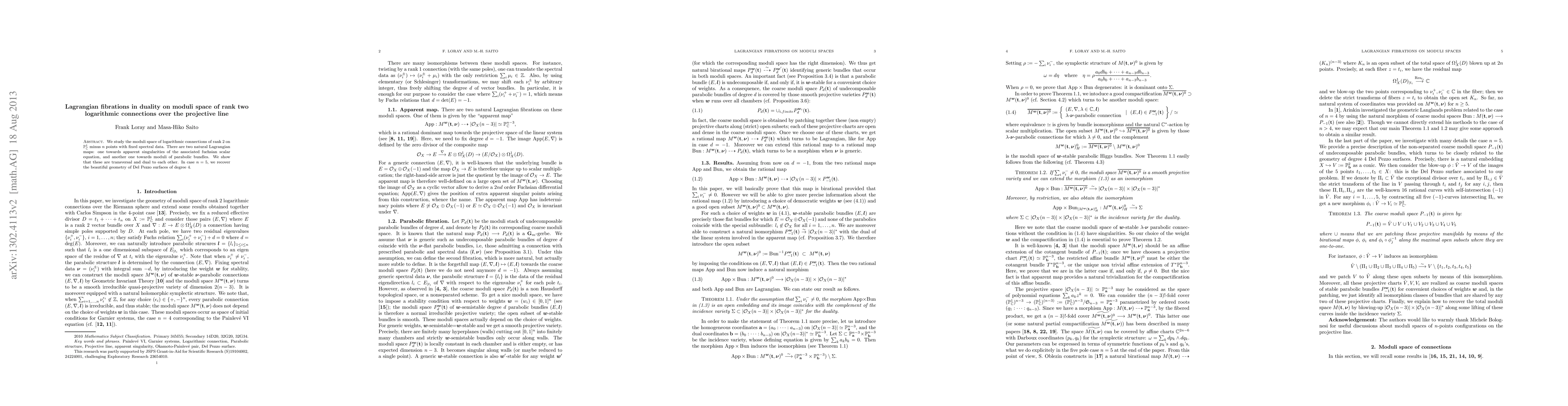 This paper investigates the moduli space of rank 2 logarithmic connections on the Riemann sphere minus n points, revealing two transversal and dual Lagrangian fibrations. For n=5, it uncovers the geometry of Del Pezzo surfaces of degree 4.