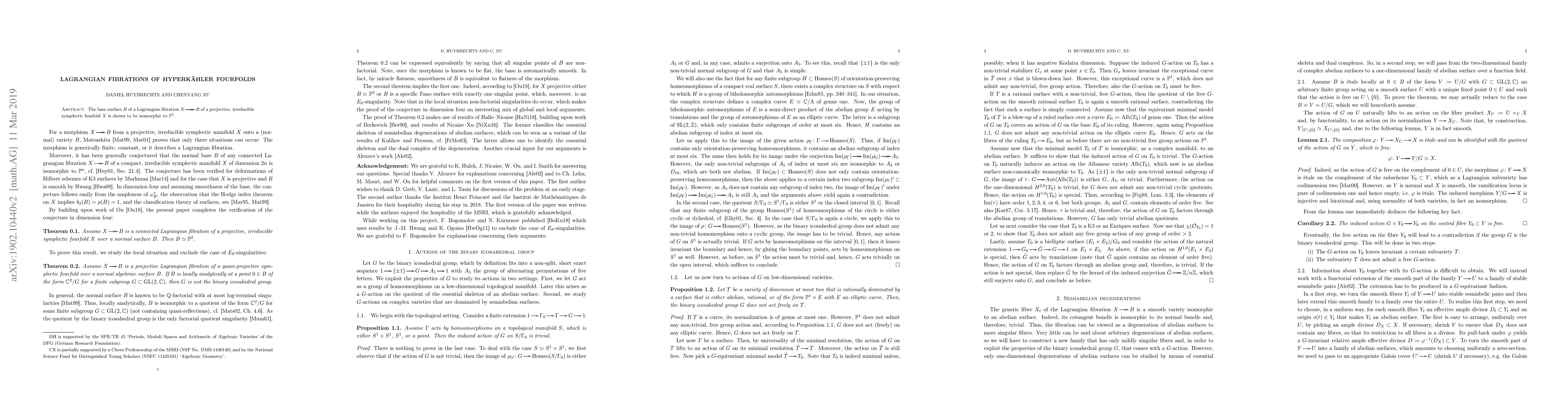 The base surface $B$ of a Lagrangian fibration $X\twoheadrightarrow B$ of a projective, irreducible symplectic fourfold $X$ is shown to be isomorphic to ${\mathbb P}^2$.