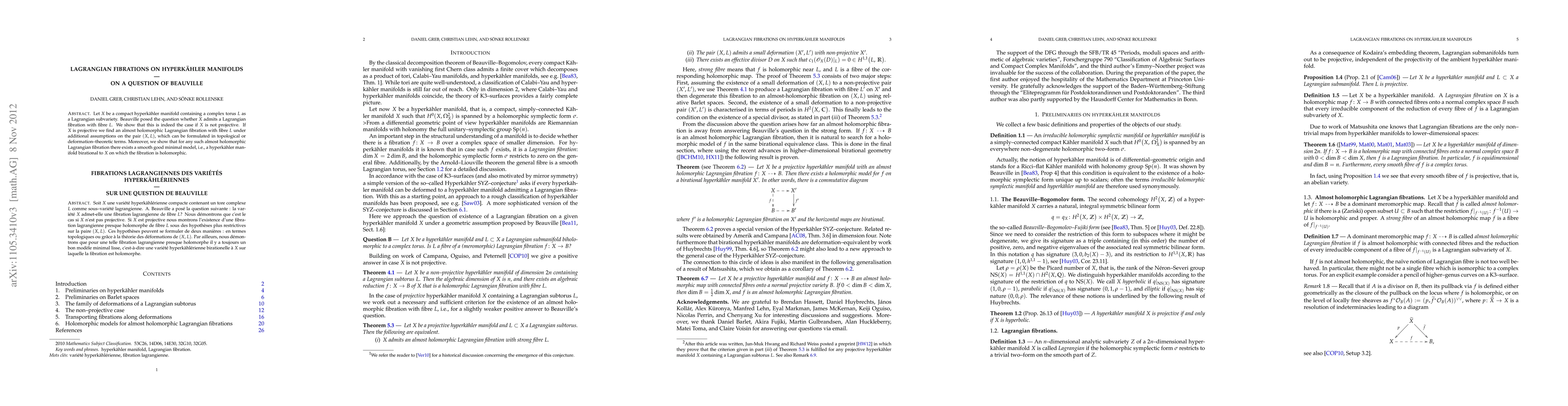 Let X be a compact hyperk\"ahler manifold containing a complex torus L as a Lagrangian subvariety. Beauville posed the question whether X admits a Lagrangian fibration with fibre L. We show that this is indeed the case if X is not projective. If X is projective we find an almost holomorphic Lagrangian fibration with fibre L under additional assumptions on the pair (X, L), which can be formulated in topological or deformation-theoretic terms. Moreover, we show that for any such almost holomorphic Lagrangian fibration there exists a smooth good minimal model, i.e., a hyperk\"ahler manifold birational to X on which the fibration is holomorphic.