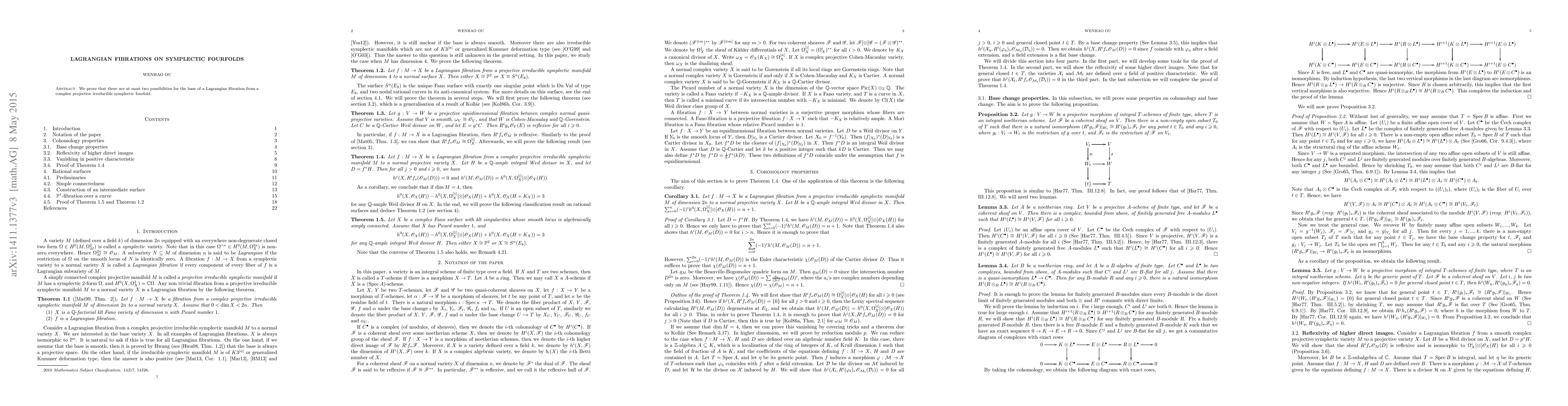 We prove that there are at most two possibilities for the base of a Lagrangian fibration from a complex projective irreducible symplectic fourfold.