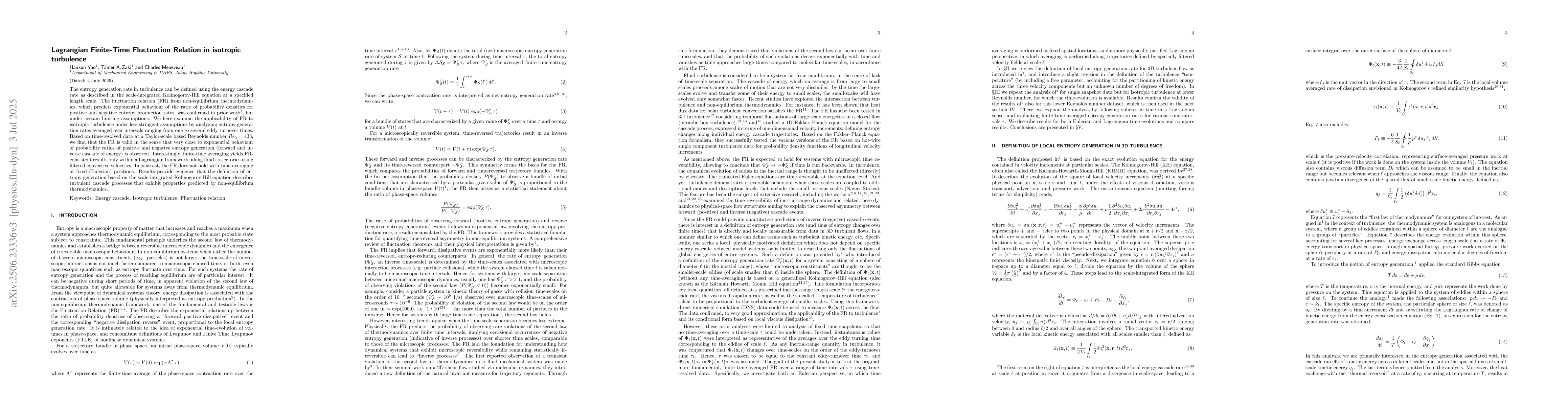 The entropy generation rate in turbulence can be defined using the energy cascade rate as described in the scale-integrated Kolmogorov-Hill equation at a specified length scale. The fluctuation relation (FR) from non-equilibrium thermodynamics, which predicts exponential behaviour of the ratio of probability densities for positive and negative entropy production rates, was confirmed in prior work \citep{yao2023entropy}, but under certain limiting assumptions. We here examine the applicability of FR to isotropic turbulence under less stringent assumptions by analyzing entropy generation rates averaged over intervals ranging from one to several eddy turnover times. Based on time-resolved data at a Taylor-scale based Reynolds number $Re_\lambda = 433$, we find that the FR is valid in the sense that very close to exponential behaviour of probability ratios of positive and negative entropy generation (forward and inverse cascade of energy) is observed. Interestingly, finite-time averaging yields FR-consistent results only within a Lagrangian framework, along fluid trajectories using filtered convective velocities. In contrast, the FR does not hold with time-averaging at fixed (Eulerian) positions. Results provide evidence that the definition of entropy generation based on the scale-integrated Kolmogorov-Hill equation describes turbulent cascade processes that exhibit properties predicted by non-equilibrium thermodynamics.