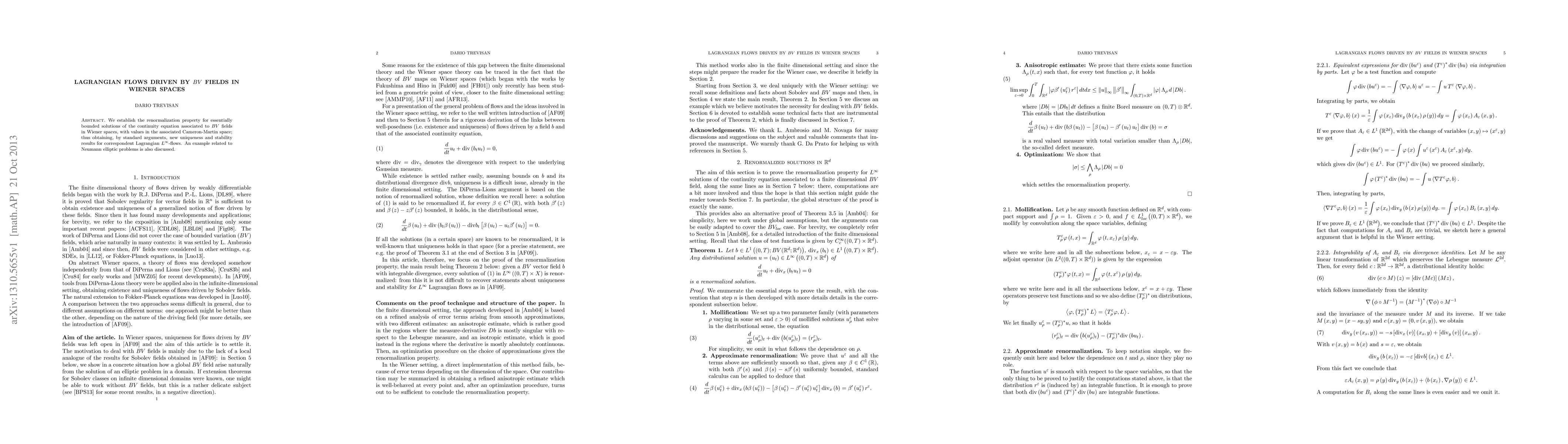 This paper establishes the renormalization property for solutions of the continuity equation driven by $BV$ fields in Wiener spaces, leading to new uniqueness and stability results for corresponding Lagrangian $L^\infty$-flows. An example related to Neumann elliptic problems is also presented.