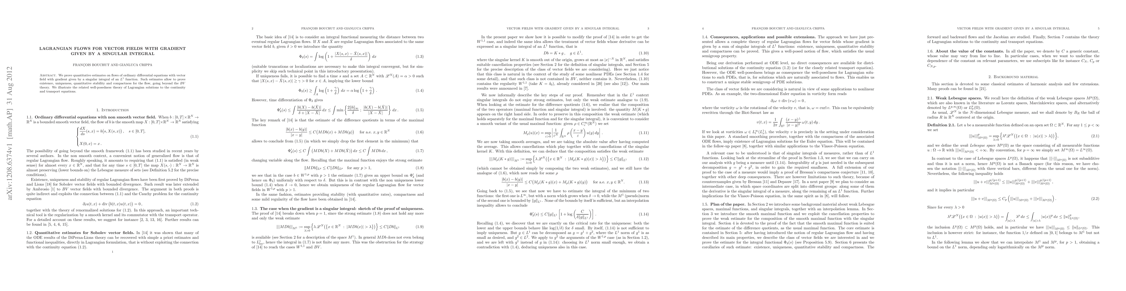 This paper proves quantitative estimates for flows of ordinary differential equations driven by vector fields whose gradients are singular integrals of $L^1$ functions, establishing existence, uniqueness, stability, and compactness beyond $BV$ theory. It also develops a well-posedness theory for Lagrangian solutions to continuity and transport equations.