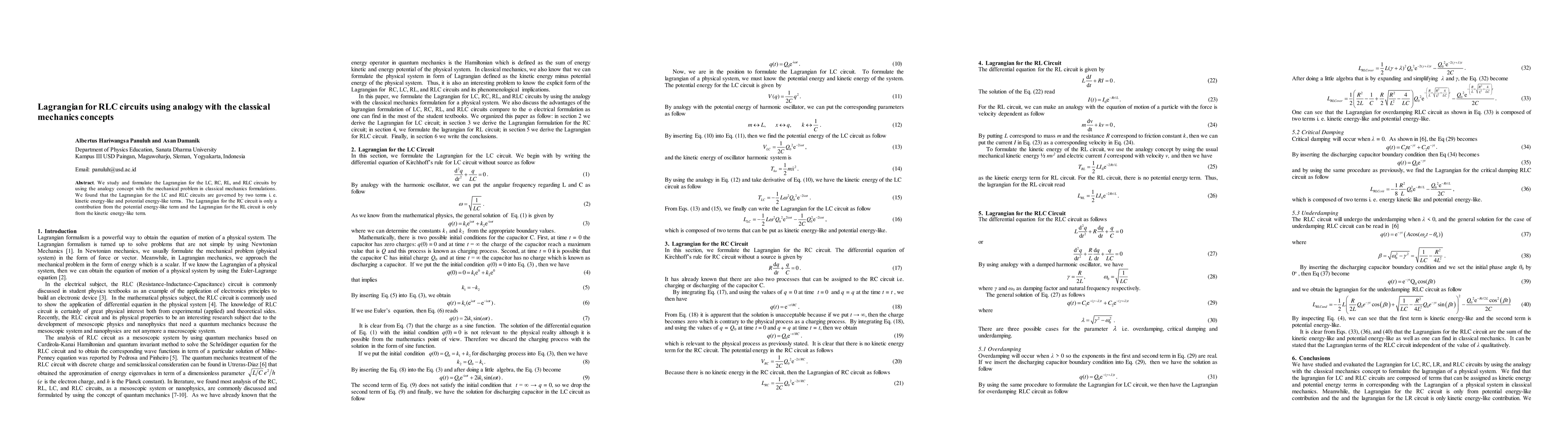 This paper formulates the Lagrangian for LC, RC, RL, and RLC circuits by drawing analogies with classical mechanics, revealing that LC and RLC circuits have both kinetic and potential energy terms, while RC circuits have only potential and RL circuits only kinetic terms.