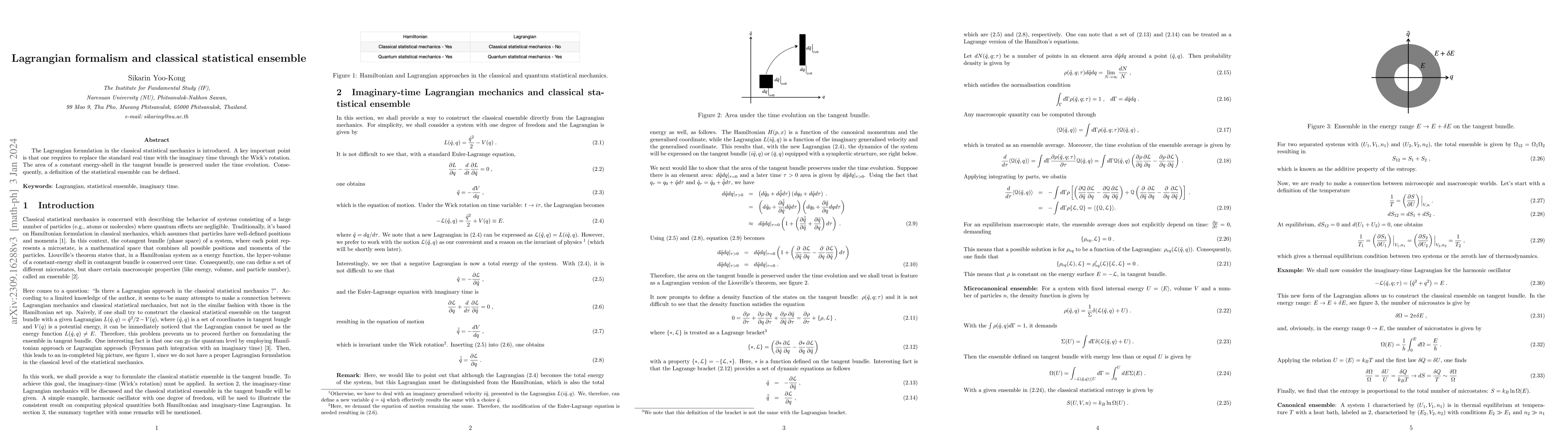 This paper introduces the Lagrangian formalism in classical statistical mechanics, emphasizing the necessity of replacing real time with imaginary time via Wick rotation. It concludes by defining the statistical ensemble based on the preserved area of a constant energy-shell in the tangent bundle under time evolution.