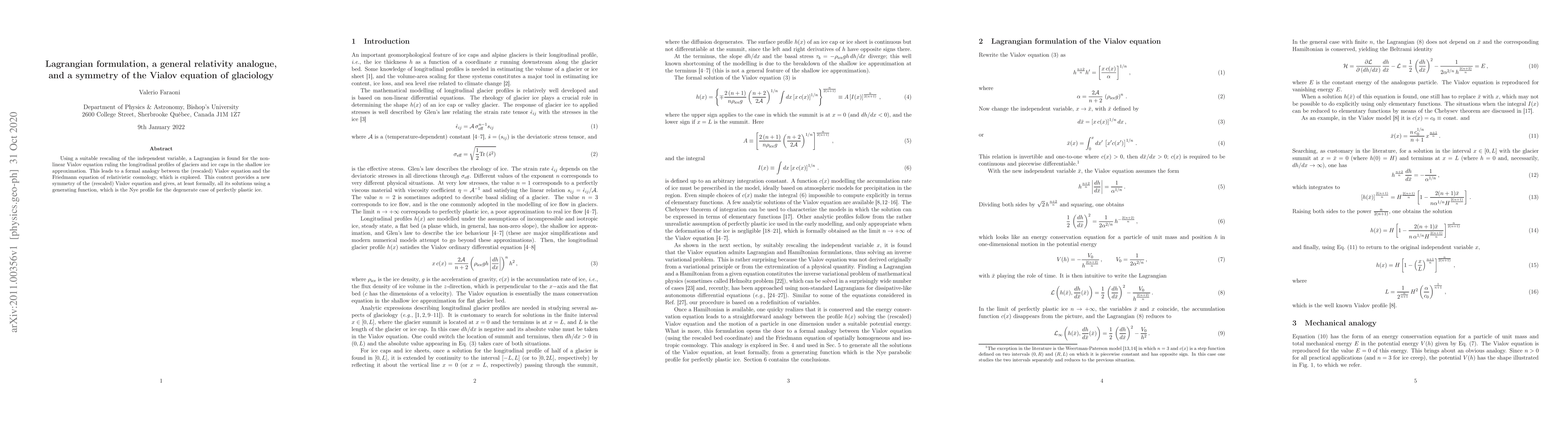Using a suitable rescaling of the independent variable, a Lagrangian is found for the nonlinear Vialov equation ruling the longitudinal profiles of glaciers and ice caps in the shallow ice approximation. This leads to a formal analogy between the (rescaled) Vialov equation and the Friedmann equation of relativistic cosmology, which is explored. This context provides a new symmetry of the (rescaled) Vialov equation and gives, at least formally, all its solutions using a generating function, which is the Nye profile for the degenerate case of perfectly plastic ice.