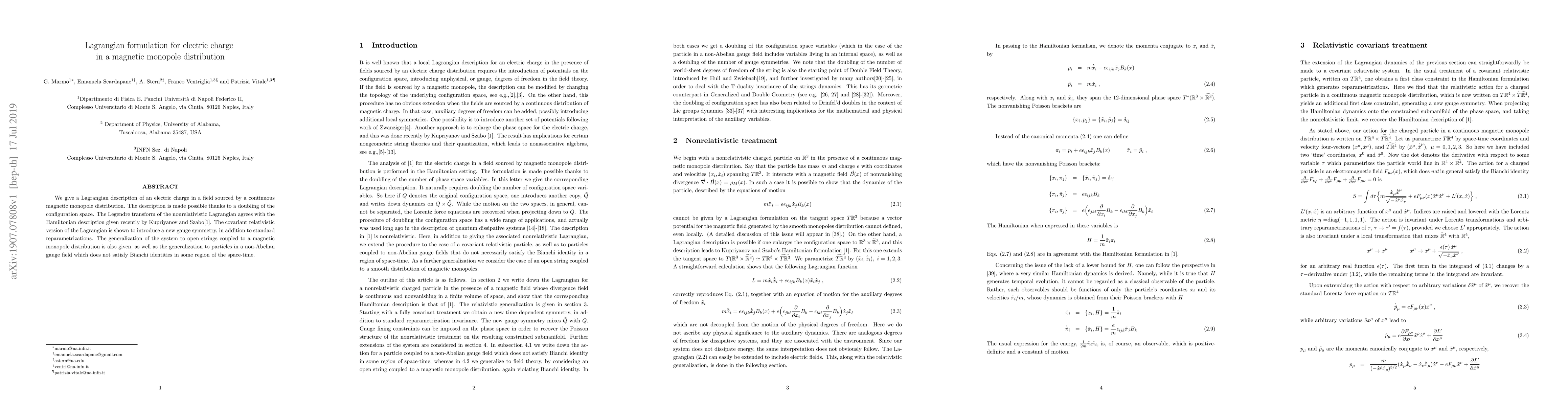 We give a Lagrangian description of an electric charge in a field sourced by a continuous magnetic monopole distribution. The description is made possible thanks to a doubling of the configuration space. The Legendre transform of the nonrelativistic Lagrangian agrees with the Hamiltonian description given recently by Kupriyanov and Szabo. The covariant relativistic version of the Lagrangian is shown to introduce a new gauge symmetry, in addition to standard reparametrizations. The generalization of the system to open strings coupled to a magnetic monopole distribution is also given, as well as the generalization to particles in a non-Abelian gauge field which does not satisfy Bianchi identities in some region of the space-time.