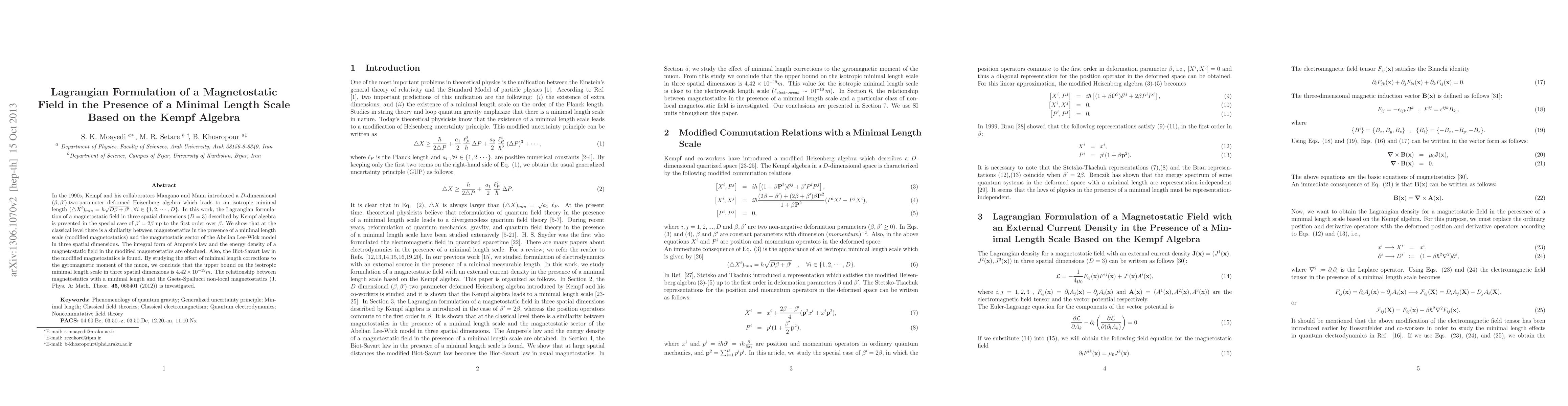This paper presents a Lagrangian formulation for magnetostatic fields in three dimensions based on the Kempf algebra, which introduces a minimal length scale. The study finds a similarity between modified magnetostatics and the Abelian Lee-Wick model, derives the integral form of Ampere's law, and determines the Biot-Savart law for the modified magnetostatics, concluding with an upper bound on the minimal length scale of $4.42\times10^{-19}m$.