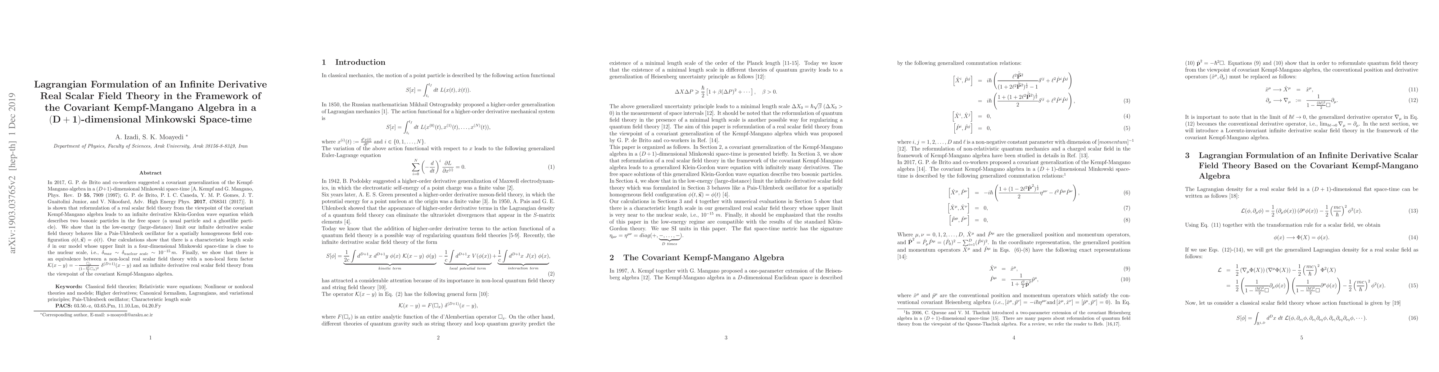 In 2017, G. P. de Brito and co-workers suggested a covariant generalization of the Kempf-Mangano algebra in a $(D+1)$-dimensional Minkowski space-time [A. Kempf and G. Mangano, Phys. Rev. D \textbf{55}, 7909 (1997); G. P. de Brito, P. I. C. Caneda, Y. M. P. Gomes, J. T. Guaitolini Junior, and V. Nikoofard, Adv. High Energy Phys. \textbf{2017}, 4768341 (2017)]. It is shown that reformulation of a real scalar field theory from the viewpoint of the covariant Kempf-Mangano algebra leads to an infinite derivative Klein-Gordon wave equation which describes two bosonic particles in the free space (a usual particle and a ghostlike particle). We show that in the low-energy (large-distance) limit our infinite derivative scalar field theory behaves like a Pais-Uhlenbeck oscillator for a spatially homogeneous field configuration $\phi(t,\vec{\textbf{x}})=\phi(t)$. Our calculations show that there is a characteristic length scale $\delta$ in our model whose upper limit in a four-dimensional Minkowski space-time is close to the nuclear scalar, i.e., $\delta_{max}\sim \delta_{nuclear\ scale}\sim 10^{-15}\, m$. Finally, we show that there is an equivalence between a non-local real scalar field theory with a non-local form factor ${\cal K}(x-y)= -\frac{\square_x}{(1-\frac{\delta^2}{2}\square_x)^2} \ \delta^{(D+1)}(x-y)$ and an infinite derivative real scalar field theory from the viewpoint of the covariant Kempf-Mangano algebra.