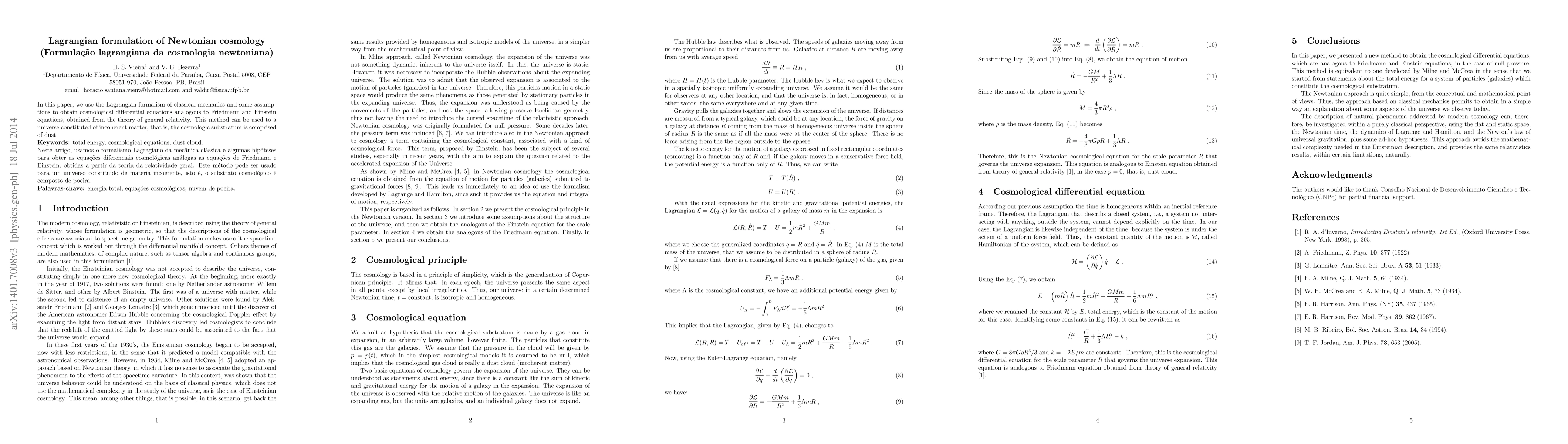 In this paper, we use the Lagrangian formalism of classical mechanics and some assumptions to obtain cosmological differential equations analogous to Friedmann and Einstein equations, obtained from the theory of general relativity. This method can be used to a universe constituted of incoherent matter, that is, the cosmologic substratum is comprised of dust.