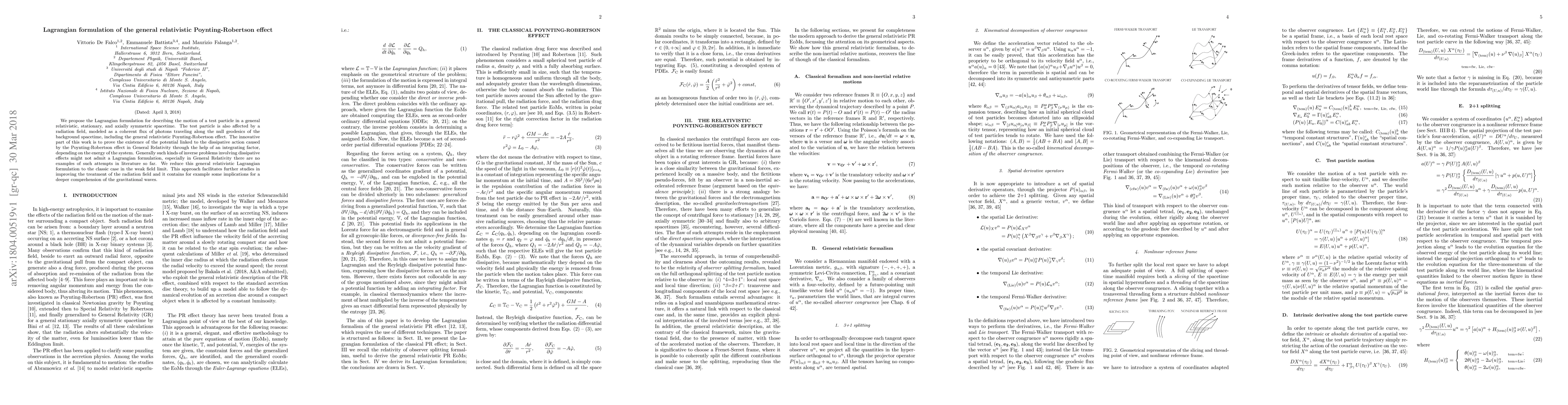 This paper proposes a Lagrangian formulation to describe the motion of a test particle in a general relativistic, stationary, and axially symmetric spacetime influenced by a radiation field, including the general relativistic Poynting-Robertson effect. It introduces a potential linked to the dissipative action caused by this effect, providing a novel approach to inverse problems in General Relativity.