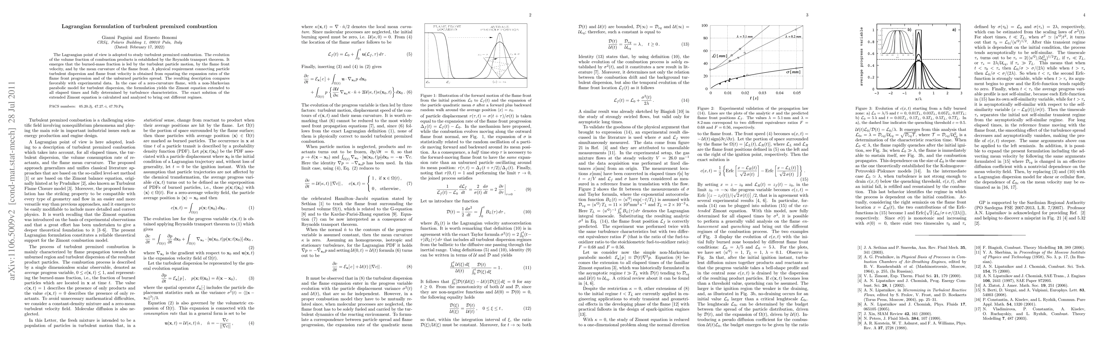 This paper adopts a Lagrangian approach to model turbulent premixed combustion, focusing on the evolution of combustion product volume fraction. It reveals that turbulent particle motion, flame front velocity, and mean curvature significantly influence the burned-mass fraction. The study also derives a physical requirement linking turbulent dispersion and flame front velocity, providing a formulation that aligns well with experimental data and extends the Zimont equation for zero-curvature flames.