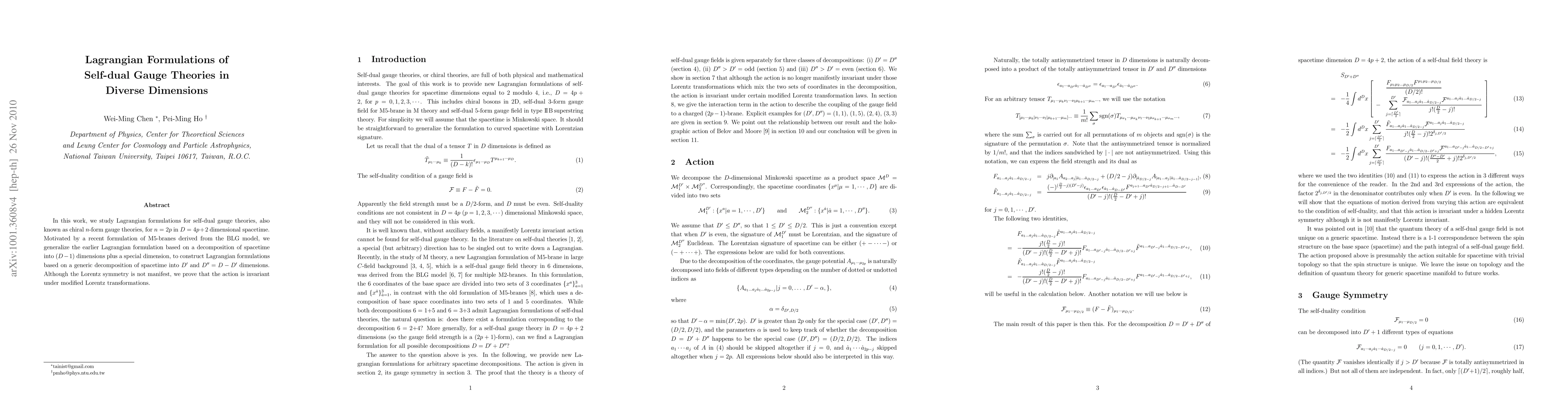 In this work, we study Lagrangian formulations for self-dual gauge theories, also known as chiral $n$-form gauge theories, for $n = 2p$ in $D = 4p+2$ dimensional spacetime. Motivated by a recent formulation of M5-branes derived from the BLG model, we generalize the earlier Lagrangian formulation based on a decomposition of spacetime into $(D-1)$ dimensions plus a special dimension, to construct Lagrangian formulations based on a generic decomposition of spacetime into $D'$ and $D" = D - D'$ dimensions. Although the Lorentz symmetry is not manifest, we prove that the action is invariant under modified Lorentz transformations.