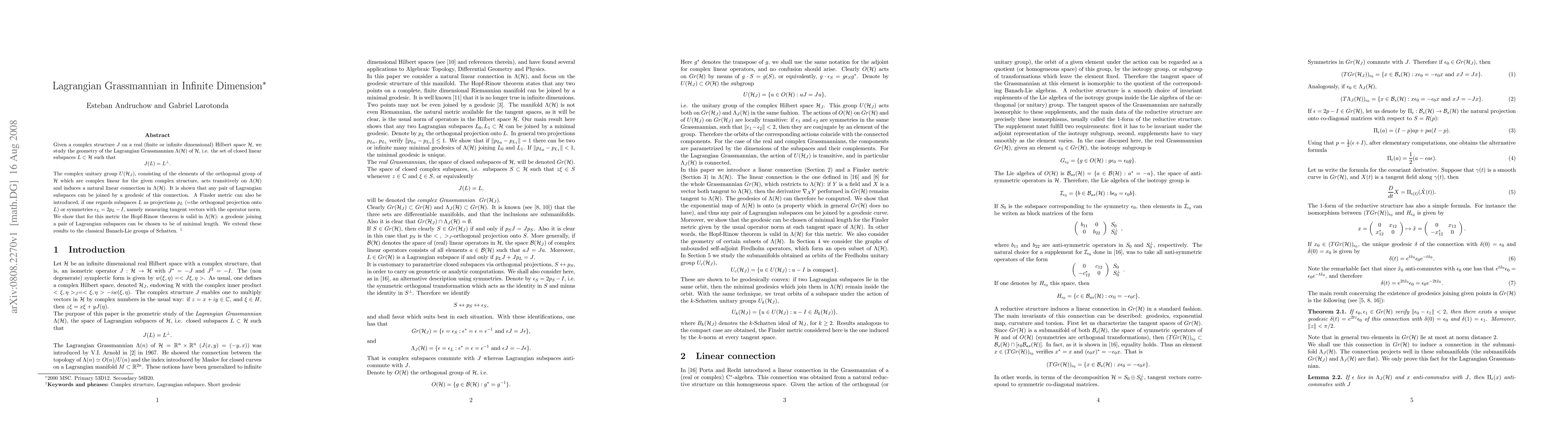 This paper studies the geometry of the Lagrangian Grassmannian in infinite dimension, showing that geodesics joining Lagrangian subspaces exist and have minimal length.