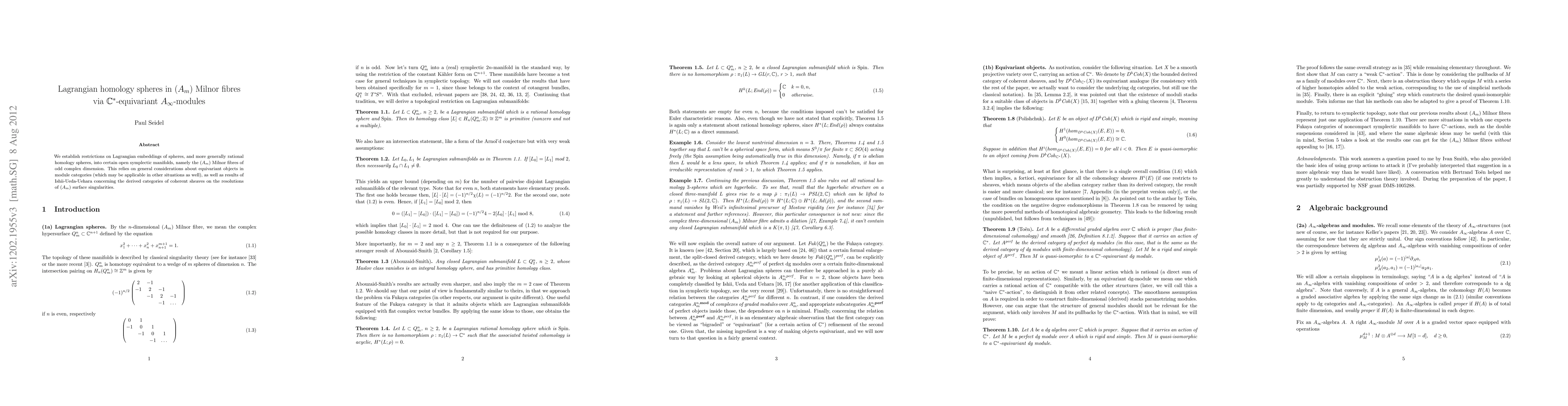 This paper explores Lagrangian embeddings of rational homology spheres in the Milnor fibres of (A_m) singularities, leveraging C^*-equivariant A_infinity modules and insights from derived categories of coherent sheaves. The study imposes constraints on these embeddings in open symplectic manifolds.