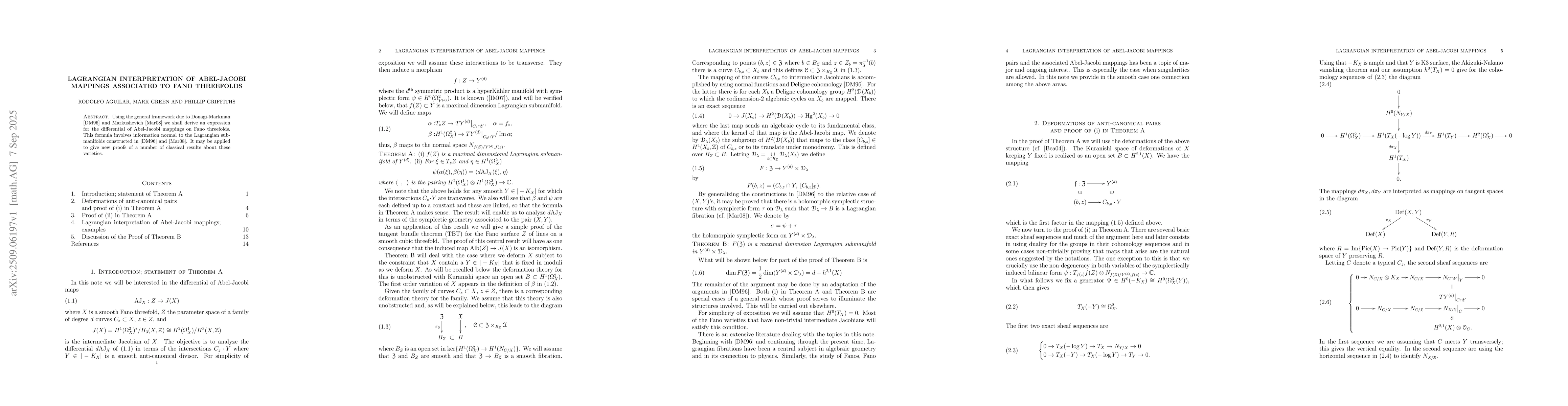Using the general framework due to Donagi-Markman \cite{DM} and Markushevich \cite{M} we shall derive an expression for the differential of Abel-Jacobi mappings on Fano threefolds. This formula involves information normal to the Lagrangian submanifolds constructed in \cite{DM} and \cite{M}. It may be applied to give new proofs of a number of classical results about these varieties.