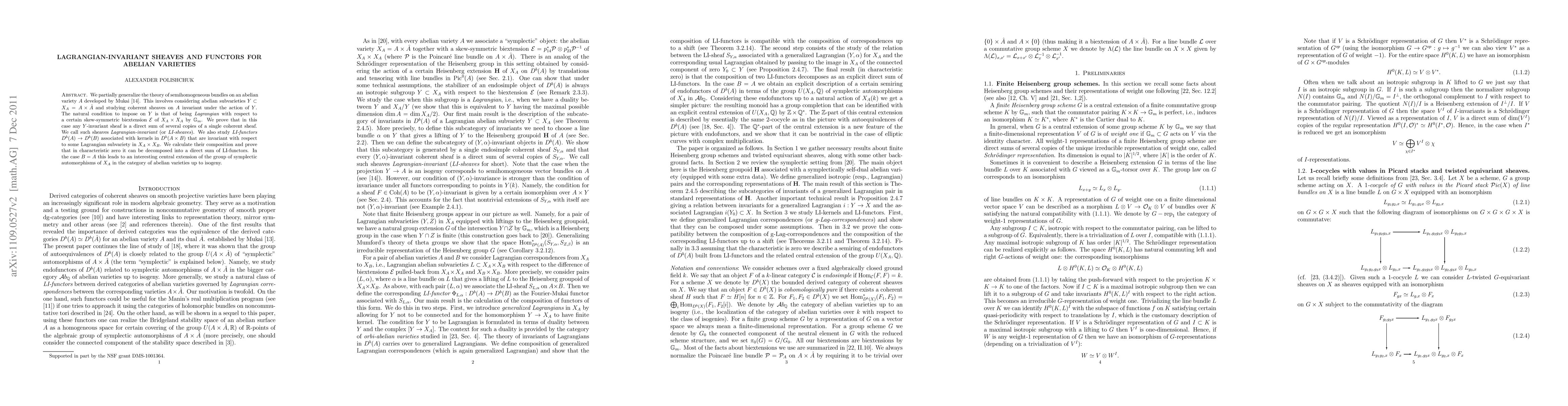 We partially generalize the theory of semihomogeneous bundles on an abelian variety $A$ developed by Mukai. This involves considering abelian subvarieties $Y\subset X_A=A\times\hat{A}$ and studying coherent sheaves on $A$ invariant under the action of $Y$. The natural condition to impose on $Y$ is that of being Lagrangian with respect to a certain skew-symmetric biextension of $X_A\times X_A$. We prove that in this case any $Y$-invariant sheaf is a direct sum of several copies of a single coherent sheaf. We call such sheaves Lagrangian-invariant (or LI-sheaves). We also study LI-functors $D^b(A)\to D^b(B)$ associated with kernels in $D^b(A\times B)$ that are invariant with respect to some Lagrangian subvariety in $X_A\times X_B$. We calculate their composition and prove that in characteristic zero it can be decomposed into a direct sum of LI-functors. In the case $B=A$ this leads to an interesting central extension of the group of symplectic automorphisms of $X_A$ in the category of abelian varieties up to isogeny.