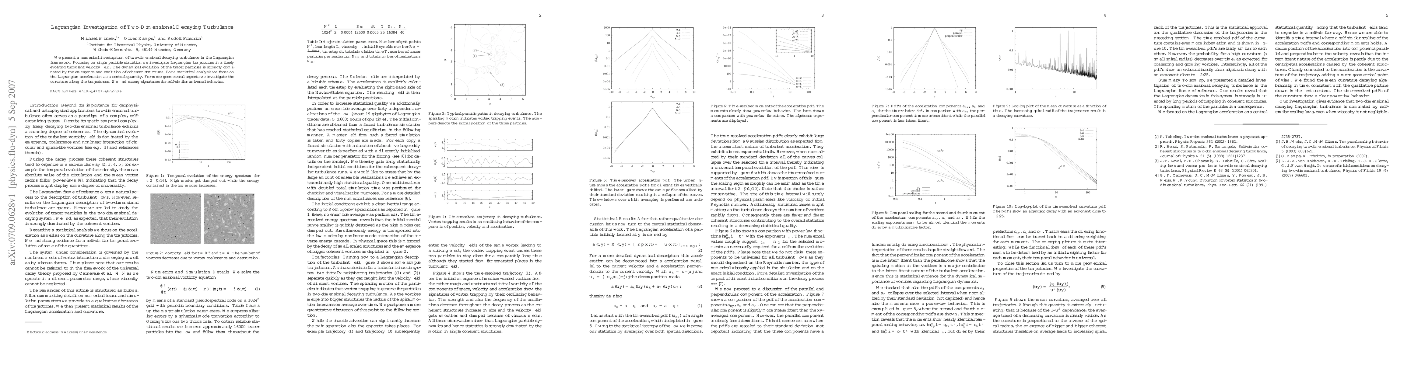 The paper presents a detailed Lagrangian investigation of two-dimensional decaying turbulence, focusing on single particle statistics and the dynamics of tracer particles in a turbulent velocity field. It introduces a comprehensive analysis of Lagrangian acceleration and curvature, revealing self-similar universal behavior in turbulent flows.