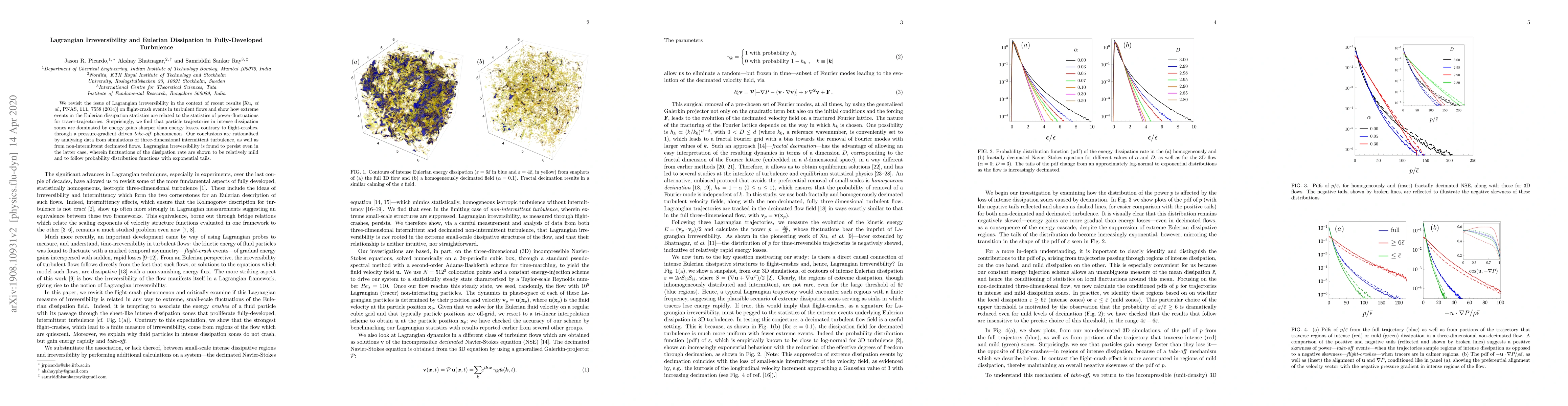 This paper explores the relationship between Lagrangian irreversibility and Eulerian dissipation in fully-developed turbulence, revealing that intense dissipation zones exhibit energy gains sharper than losses due to a pressure-gradient driven phenomenon. The study uses simulation data from three-dimensional intermittent turbulence and non-intermittent decimated flows to demonstrate persistent Lagrangian irreversibility despite relatively mild dissipation rate fluctuations.