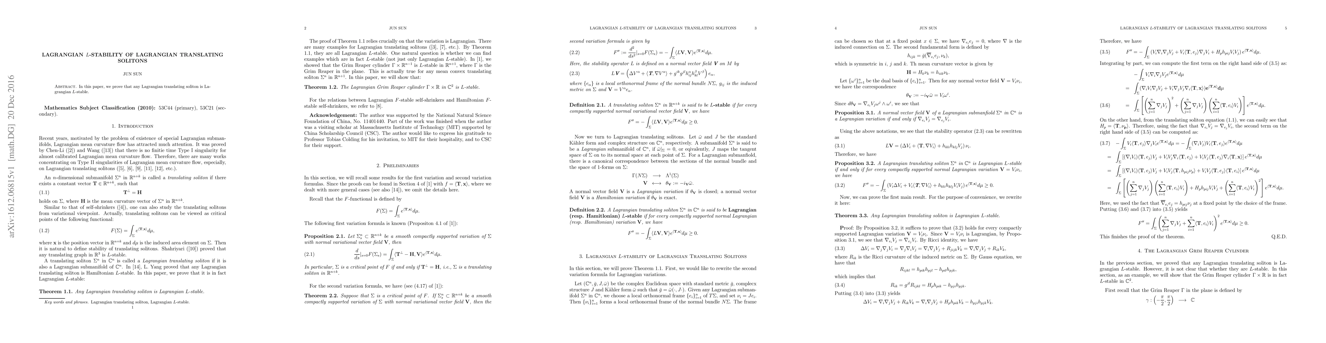 Summary: This paper demonstrates that any Lagrangian translating soliton exhibits Lagrangian $L$-stability, providing a significant result in the study of differential geometry and soliton theory.