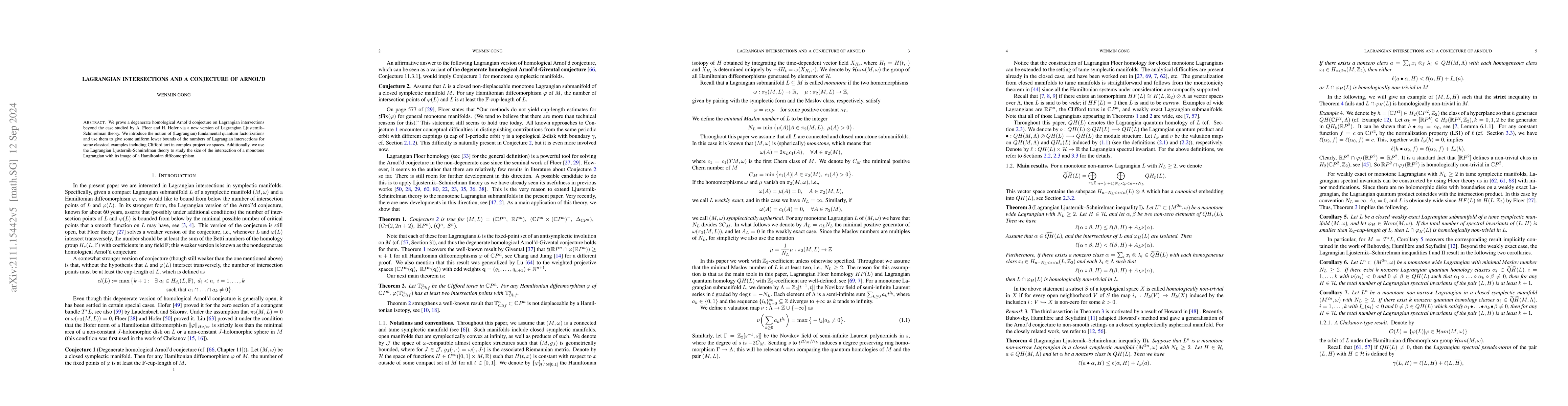 This paper develops a Lagrangian version of Ljusternik-Schnirelman theory to prove the degenerate Arnold conjecture on Lagrangian intersections, providing estimates for the number of intersection points in degenerate cases. It also introduces fundamental quantum factorizations to establish uniform lower bounds for the number of monotone Lagrangian intersections.