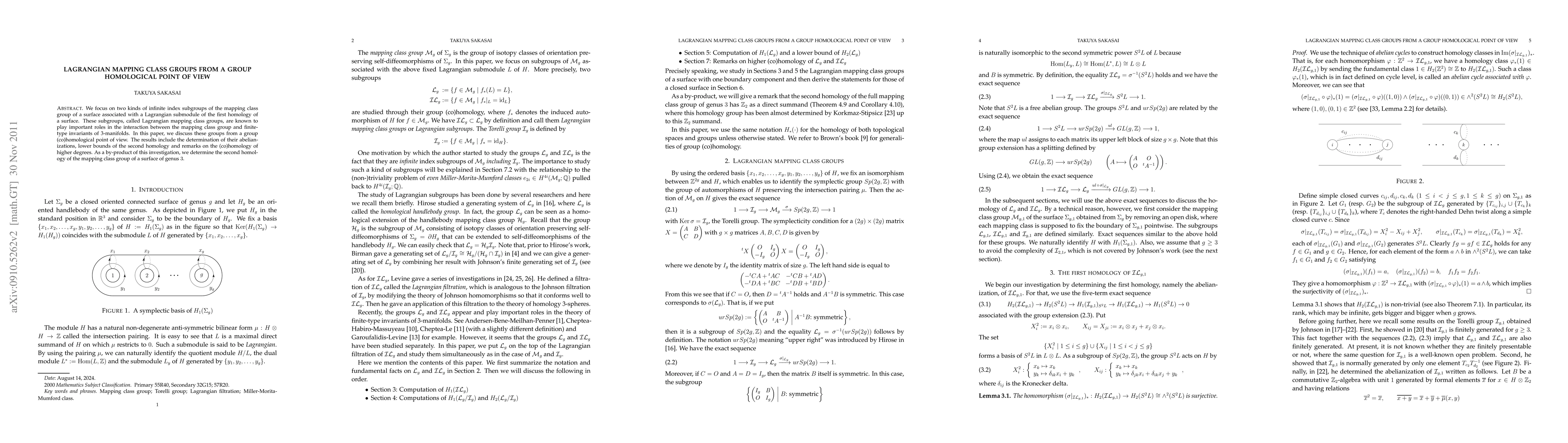 We focus on two kinds of infinite index subgroups of the mapping class group of a surface associated with a Lagrangian submodule of the first homology of a surface. These subgroups, called Lagrangian mapping class groups, are known to play important roles in the interaction between the mapping class group and finite-type invariants of 3-manifolds. In this paper, we discuss these groups from a group (co)homological point of view. The results include the determination of their abelianizations, lower bounds of the second homology and remarks on the (co)homology of higher degrees. As a by-product of this investigation, we determine the second homology of the mapping class group of a surface of genus 3.