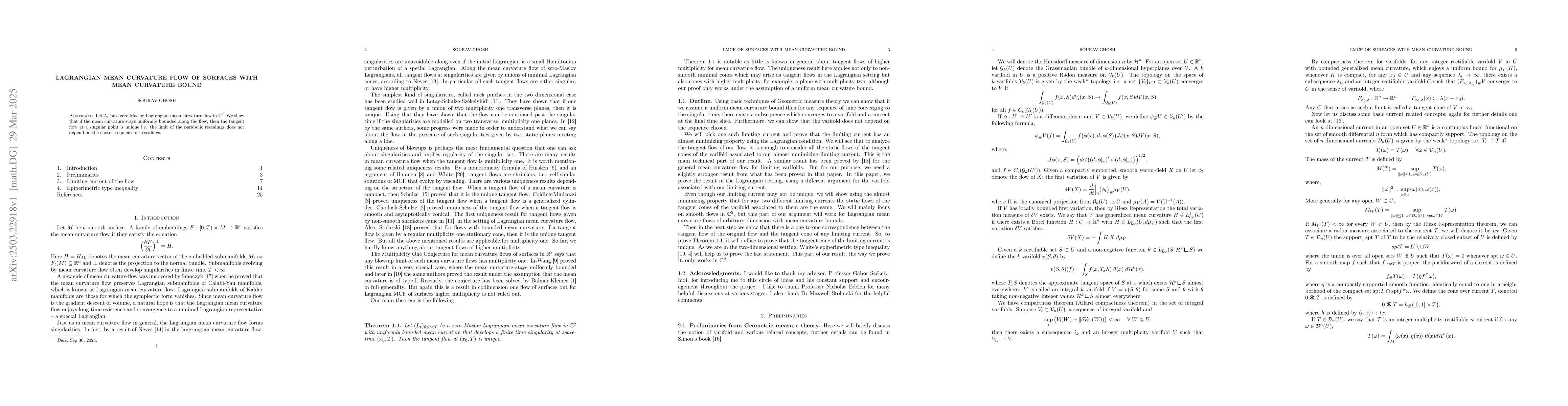 This research extends prior findings on mean curvature flows by focusing on Lagrangian surfaces with mean curvature bounds, proving uniqueness of tangent flows at singular points, which was not addressed in previous studies.