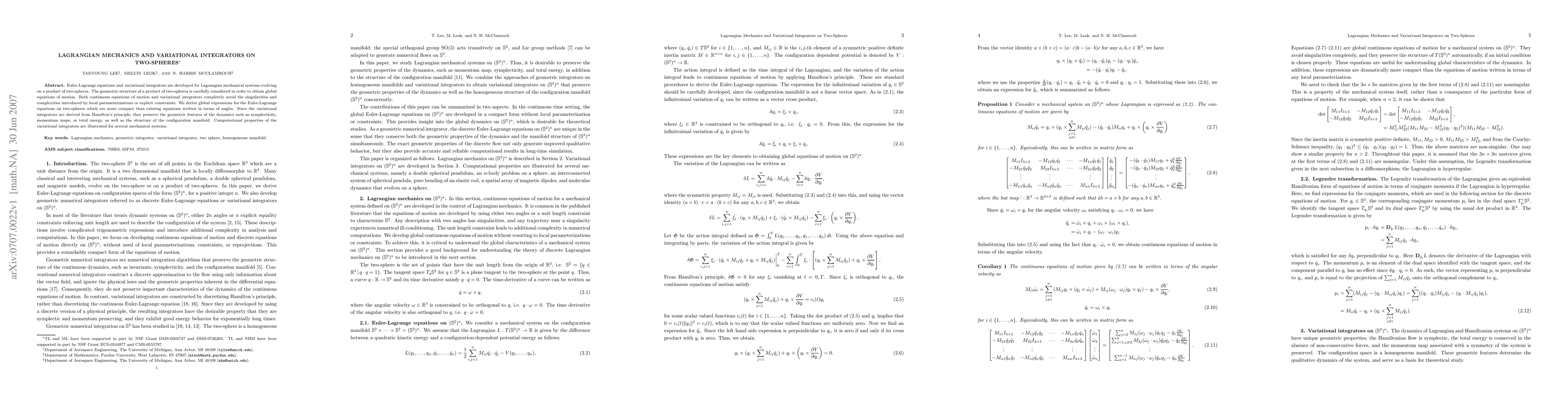 Euler-Lagrange equations and variational integrators are developed for Lagrangian mechanical systems evolving on a product of two-spheres. The geometric structure of a product of two-spheres is carefully considered in order to obtain global equations of motion. Both continuous equations of motion and variational integrators completely avoid the singularities and complexities introduced by local parameterizations or explicit constraints. We derive global expressions for the Euler-Lagrange equations on two-spheres which are more compact than existing equations written in terms of angles. Since the variational integrators are derived from Hamilton's principle, they preserve the geometric features of the dynamics such as symplecticity, momentum maps, or total energy, as well as the structure of the configuration manifold. Computational properties of the variational integrators are illustrated for several mechanical systems.