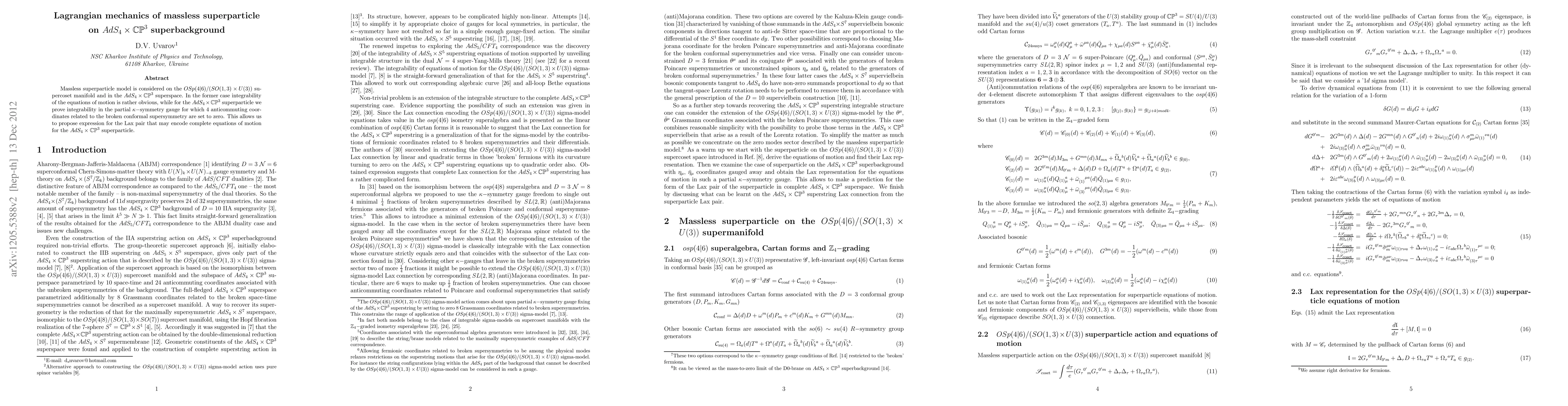 This paper investigates the Lagrangian mechanics of a massless superparticle on an AdS_4 x CP^3 superbackground, proving integrability for the AdS_4 x CP^3 superparticle in a specific gauge and proposing a Lax pair that encodes its complete equations of motion.