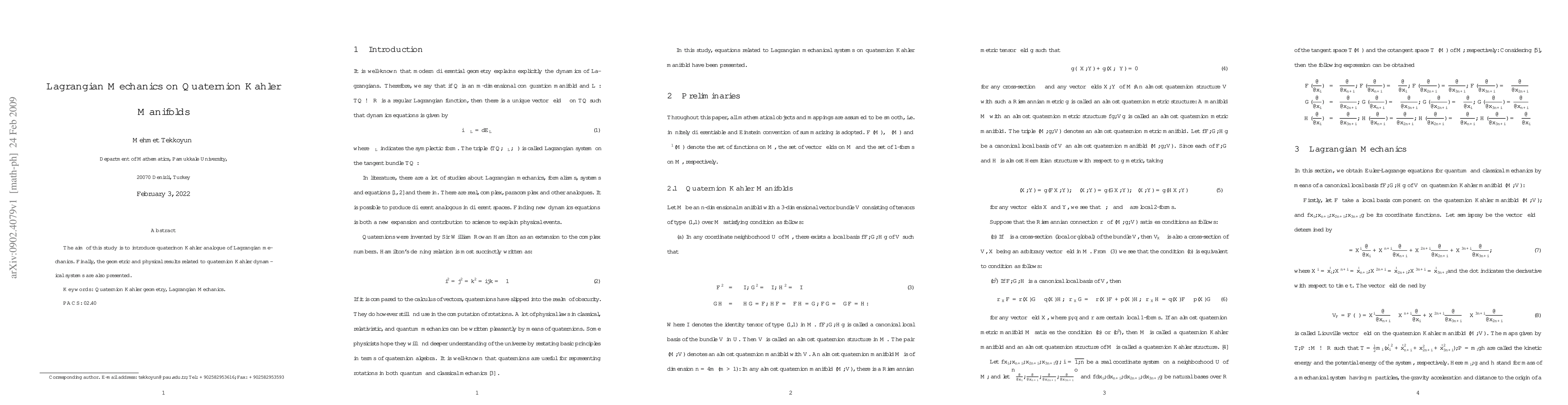 This paper introduces a quaternion Kaehler analogue of Lagrangian mechanics, providing geometric and physical results related to quaternion Kaehler dynamical systems. The study extends classical mechanics to the quaternionic setting, offering new insights into the underlying structure of such systems.