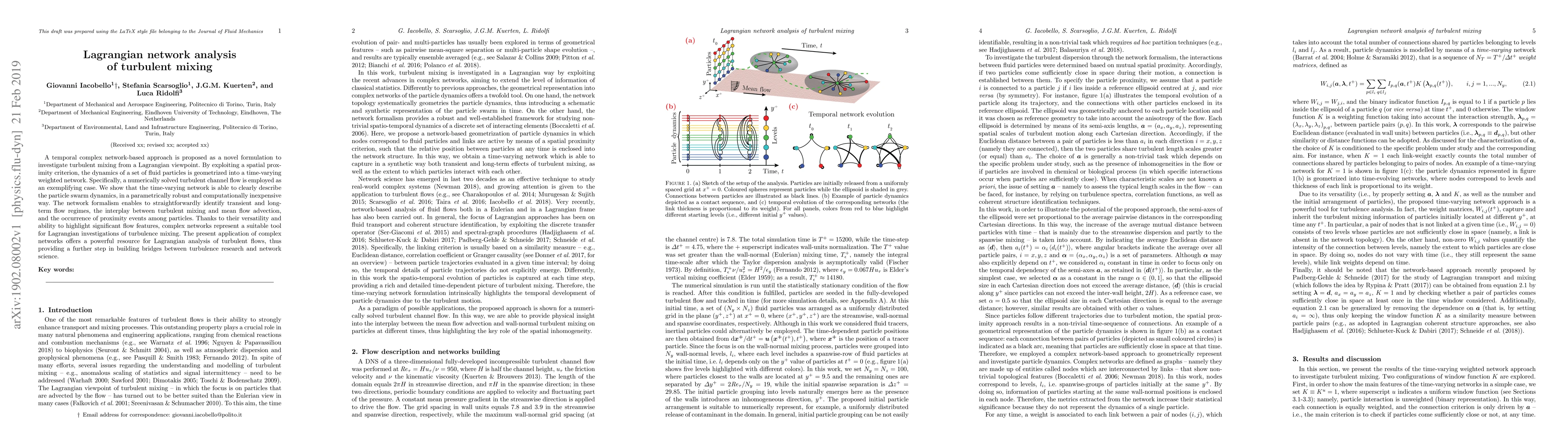 This paper proposes a novel temporal complex network approach to analyze turbulent mixing from a Lagrangian perspective, demonstrating its effectiveness through a turbulent channel flow case study. The method geometrizes fluid particle dynamics into a time-varying weighted network, revealing transient and long-term flow regimes and the interplay between turbulent mixing and mean flow advection.