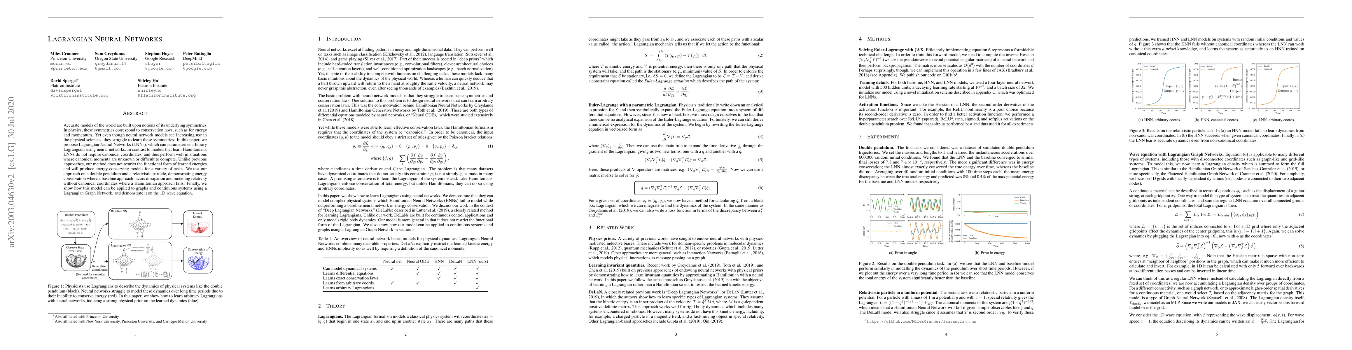 This paper introduces Lagrangian Neural Networks (LNNs) that parameterize arbitrary Lagrangians using neural networks, enabling energy-conserving models without requiring canonical coordinates. The method demonstrates superior performance in tasks involving unknown or difficult-to-compute canonical momenta, as shown through applications to a double pendulum, a relativistic particle, and a 1D wave equation.