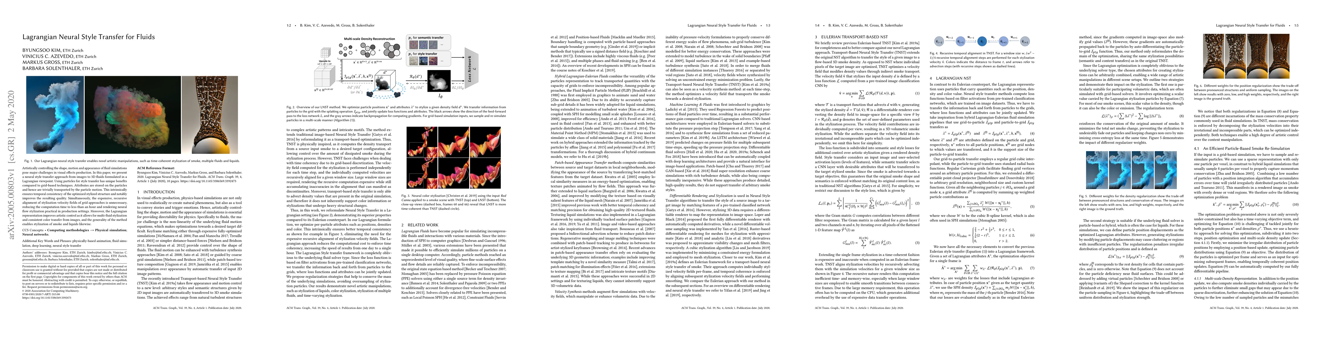 This paper introduces a Lagrangian neural style transfer method for fluid simulations, leveraging particle-based techniques to achieve temporal consistency and reduce computation time. The method enhances artistic control for multi-fluid stylization and color transfer, making it practical for visual effects production.