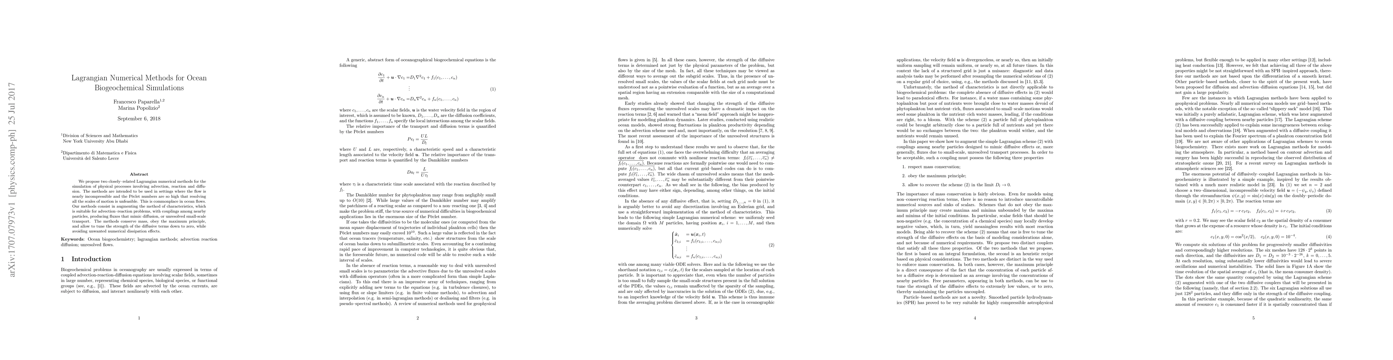 We propose two closely--related Lagrangian numerical methods for the simulation of physical processes involving advection, reaction and diffusion. The methods are intended to be used in settings where the flow is nearly incompressible and the P\'eclet numbers are so high that resolving all the scales of motion is unfeasible. This is commonplace in ocean flows. Our methods consist in augmenting the method of characteristics, which is suitable for advection--reaction problems, with couplings among nearby particles, producing fluxes that mimic diffusion, or unresolved small-scale transport. The methods conserve mass, obey the maximum principle, and allow to tune the strength of the diffusive terms down to zero, while avoiding unwanted numerical dissipation effects.