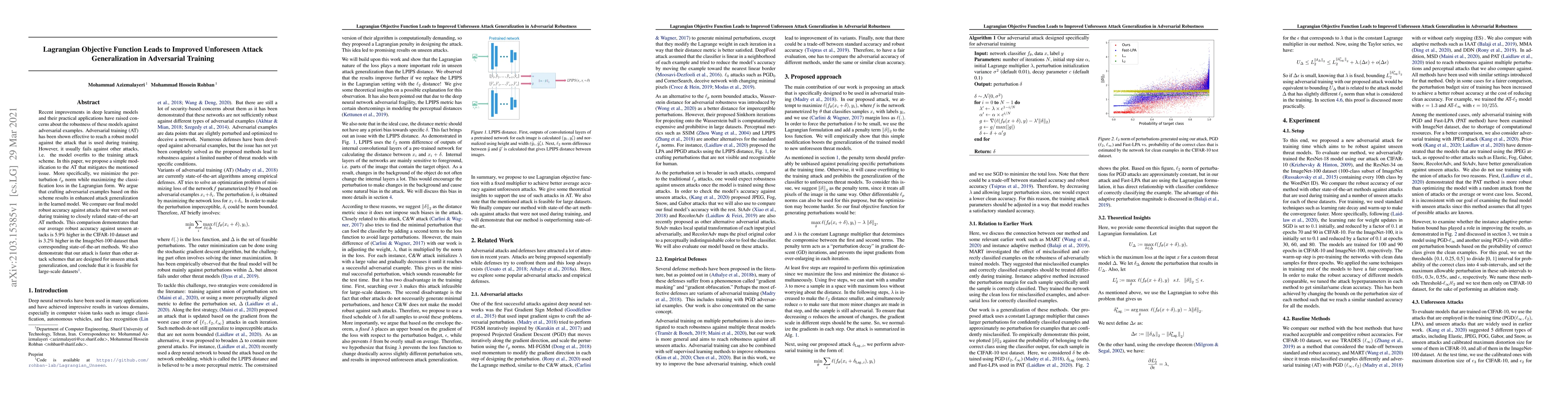 Recent improvements in deep learning models and their practical applications have raised concerns about the robustness of these models against adversarial examples. Adversarial training (AT) has been shown effective to reach a robust model against the attack that is used during training. However, it usually fails against other attacks, i.e. the model overfits to the training attack scheme. In this paper, we propose a simple modification to the AT that mitigates the mentioned issue. More specifically, we minimize the perturbation $\ell_p$ norm while maximizing the classification loss in the Lagrangian form. We argue that crafting adversarial examples based on this scheme results in enhanced attack generalization in the learned model. We compare our final model robust accuracy against attacks that were not used during training to closely related state-of-the-art AT methods. This comparison demonstrates that our average robust accuracy against unseen attacks is 5.9% higher in the CIFAR-10 dataset and is 3.2% higher in the ImageNet-100 dataset than corresponding state-of-the-art methods. We also demonstrate that our attack is faster than other attack schemes that are designed for unseen attack generalization, and conclude that it is feasible for large-scale datasets.