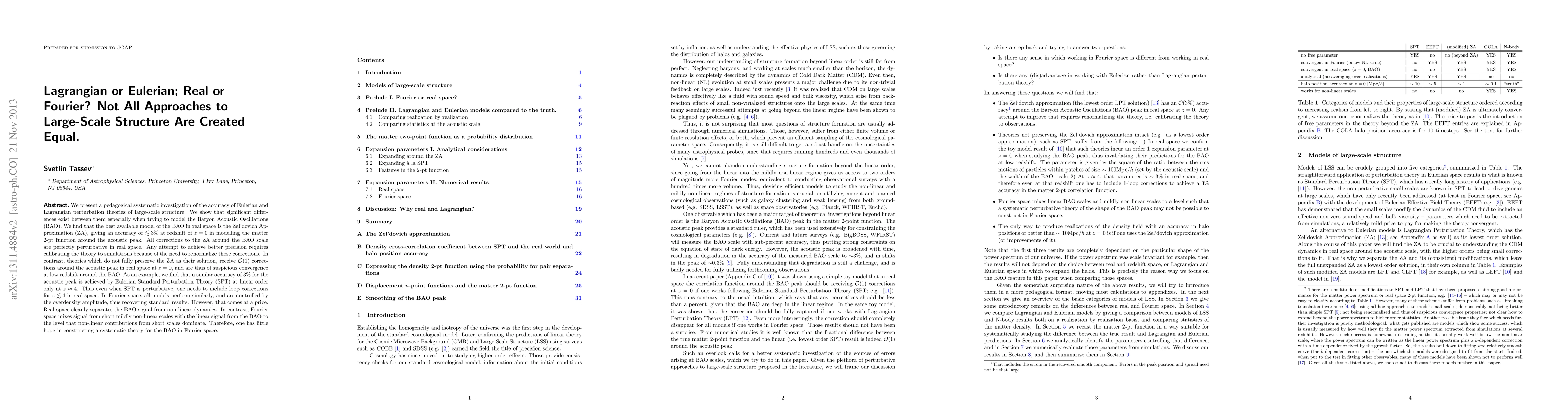 This paper investigates the accuracy of Eulerian and Lagrangian perturbation theories in modeling large-scale structure, particularly the Baryon Acoustic Oscillations (BAO). It finds that the Zel'dovich Approximation in real space provides the best accuracy (<~3% at z=0), while Eulerian methods require higher-order corrections and calibration to simulations for similar precision. Fourier space models perform similarly but mix non-linear signals with the BAO, complicating analysis.