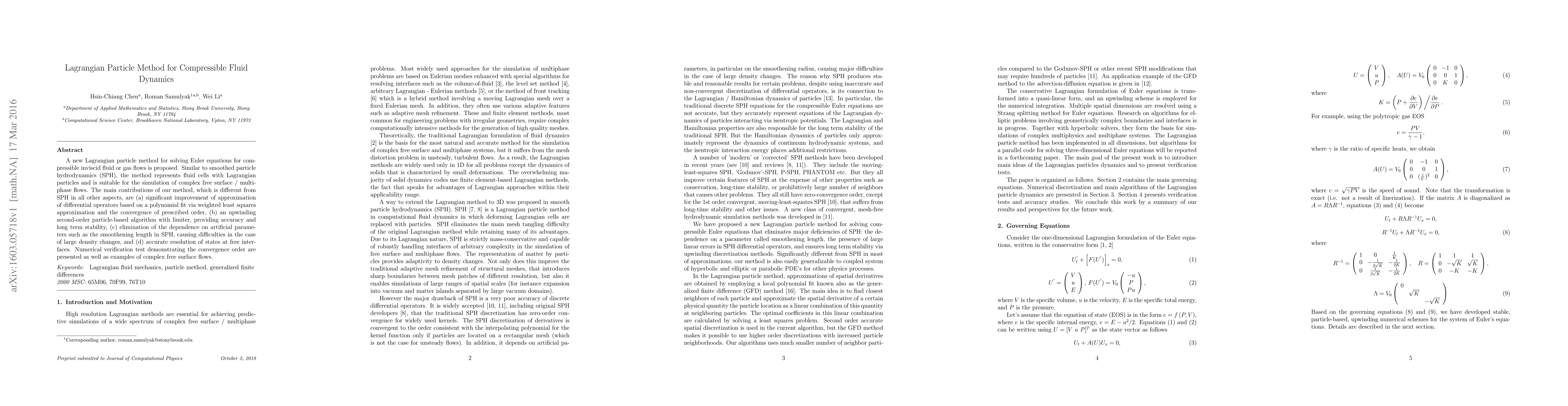 This paper proposes a new Lagrangian particle method for simulating compressible fluid flows using Euler equations. It improves differential operator approximation and introduces an upwinding second-order algorithm, eliminating the need for artificial parameters and providing accurate interface resolution, as demonstrated by numerical tests.