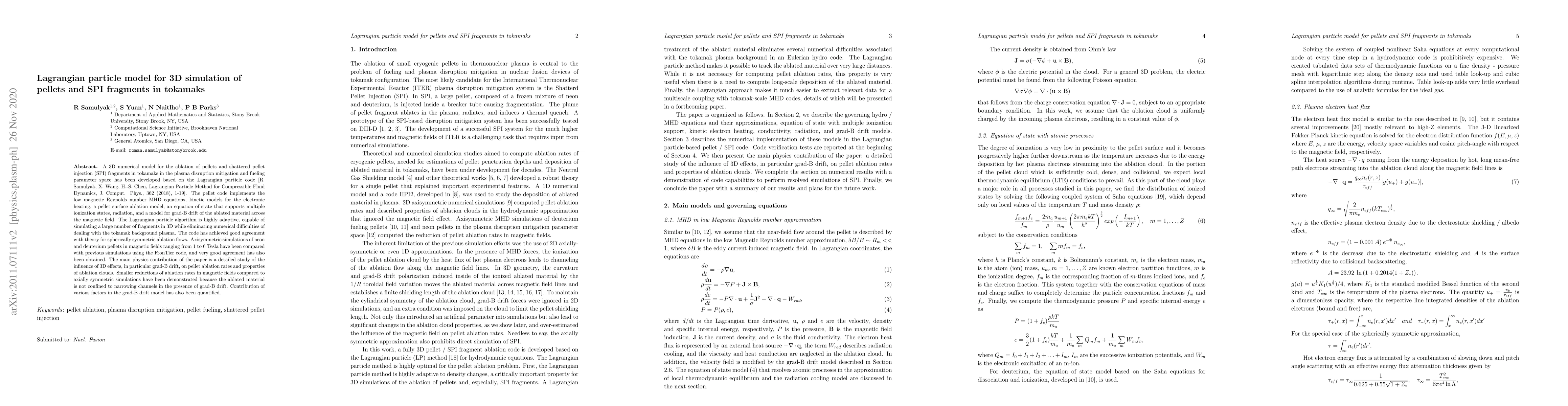 This paper develops a 3D Lagrangian particle model to simulate pellet ablation and SPI fragments in tokamaks, focusing on plasma disruption mitigation and fueling parameters. The model shows good agreement with theory and previous simulations, highlighting the influence of 3D effects, particularly grad-B drift, on ablation rates and ablation cloud properties.
