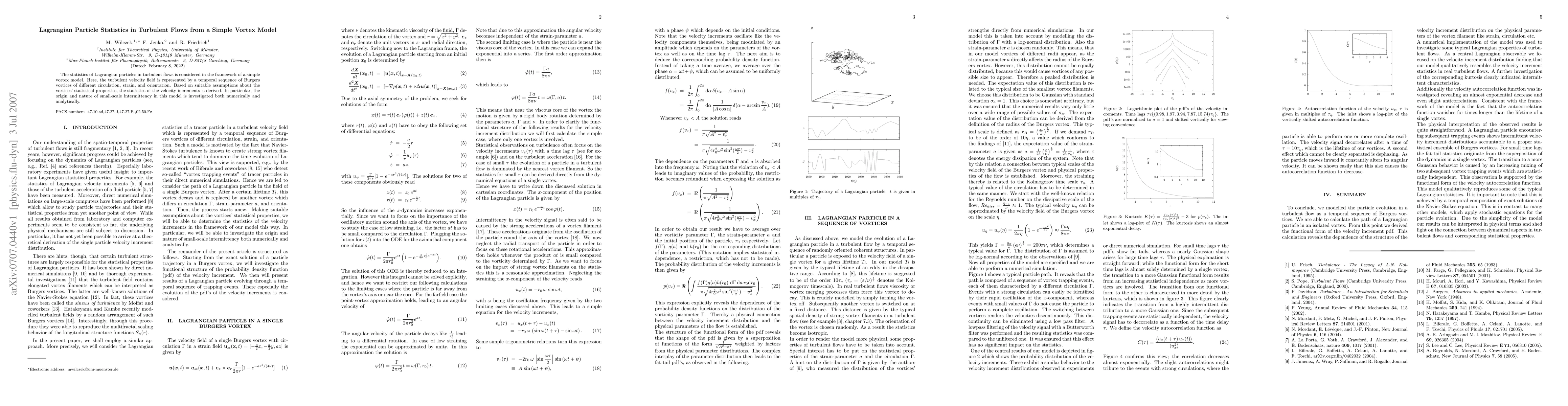 This paper explores the statistics of Lagrangian particles in turbulent flows using a simple vortex model, where the turbulent velocity field is composed of a sequence of Burgers vortices. It investigates the origin and nature of small-scale intermittency through both numerical simulations and analytical derivations.