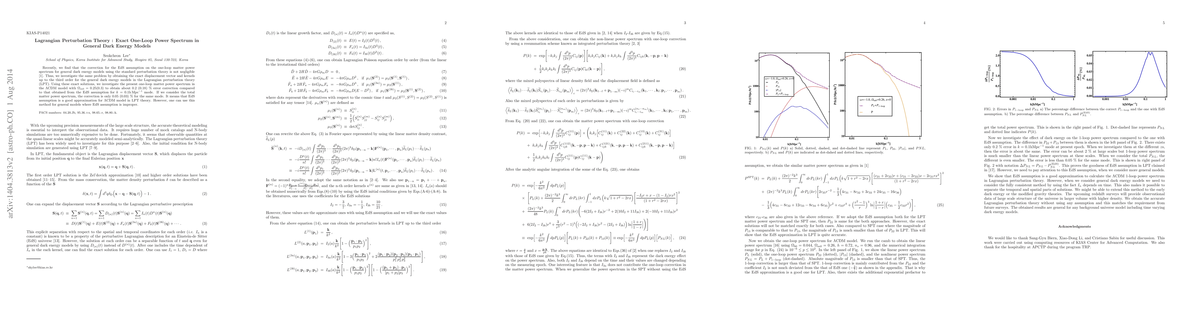 This paper presents an exact one-loop power spectrum for the matter distribution in general dark energy models using Lagrangian perturbation theory, correcting previous errors from the EdS assumption. The method shows a 0.2% (0.18%) error reduction for the $\Lambda$CDM model compared to the EdS approximation, indicating its utility for models where EdS is not suitable.