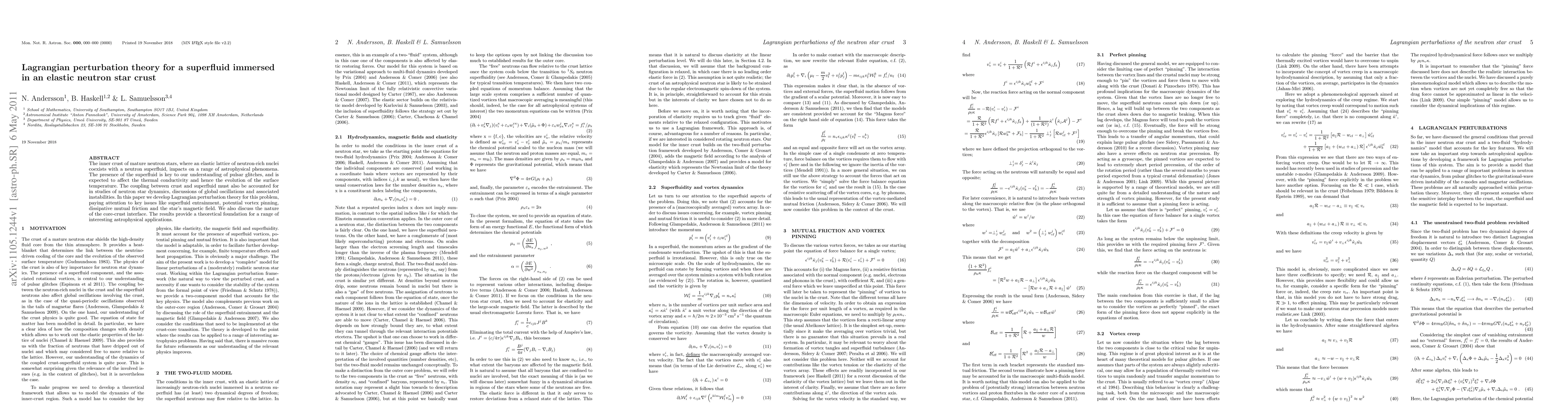 This paper develops Lagrangian perturbation theory to study the coupling between the elastic neutron star crust and the superfluid component, focusing on phenomena like superfluid entrainment and vortex pinning, which are crucial for understanding neutron star dynamics and the origin of pulsar glitches. The theoretical framework provides insights into the core-crust interface and thermal conductivity.