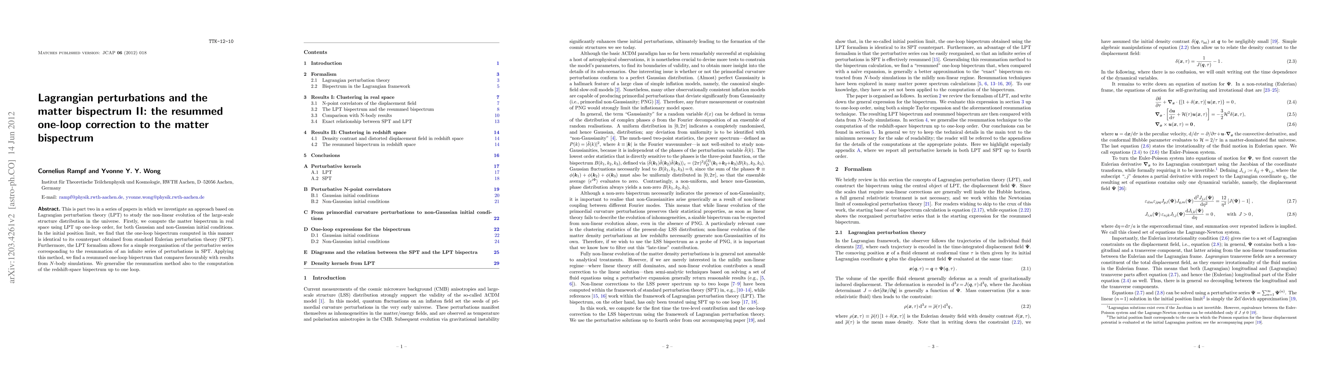 This is part two in a series of papers in which we investigate an approach based on Lagrangian perturbation theory (LPT) to study the non-linear evolution of the large-scale structure distribution in the universe. Firstly, we compute the matter bispectrum in real space using LPT up one-loop order, for both Gaussian and non-Gaussian initial conditions. In the initial position limit, we find that the one-loop bispectrum computed in this manner is identical to its counterpart obtained from standard Eulerian perturbation theory (SPT). Furthermore, the LPT formalism allows for a simple reorganisation of the perturbative series corresponding to the resummation of an infinite series of perturbations in SPT. Applying this method, we find a resummed one-loop bispectrum that compares favourably with results from N-body simulations. We generalise the resummation method also to the computation of the redshift-space bispectrum up to one loop.